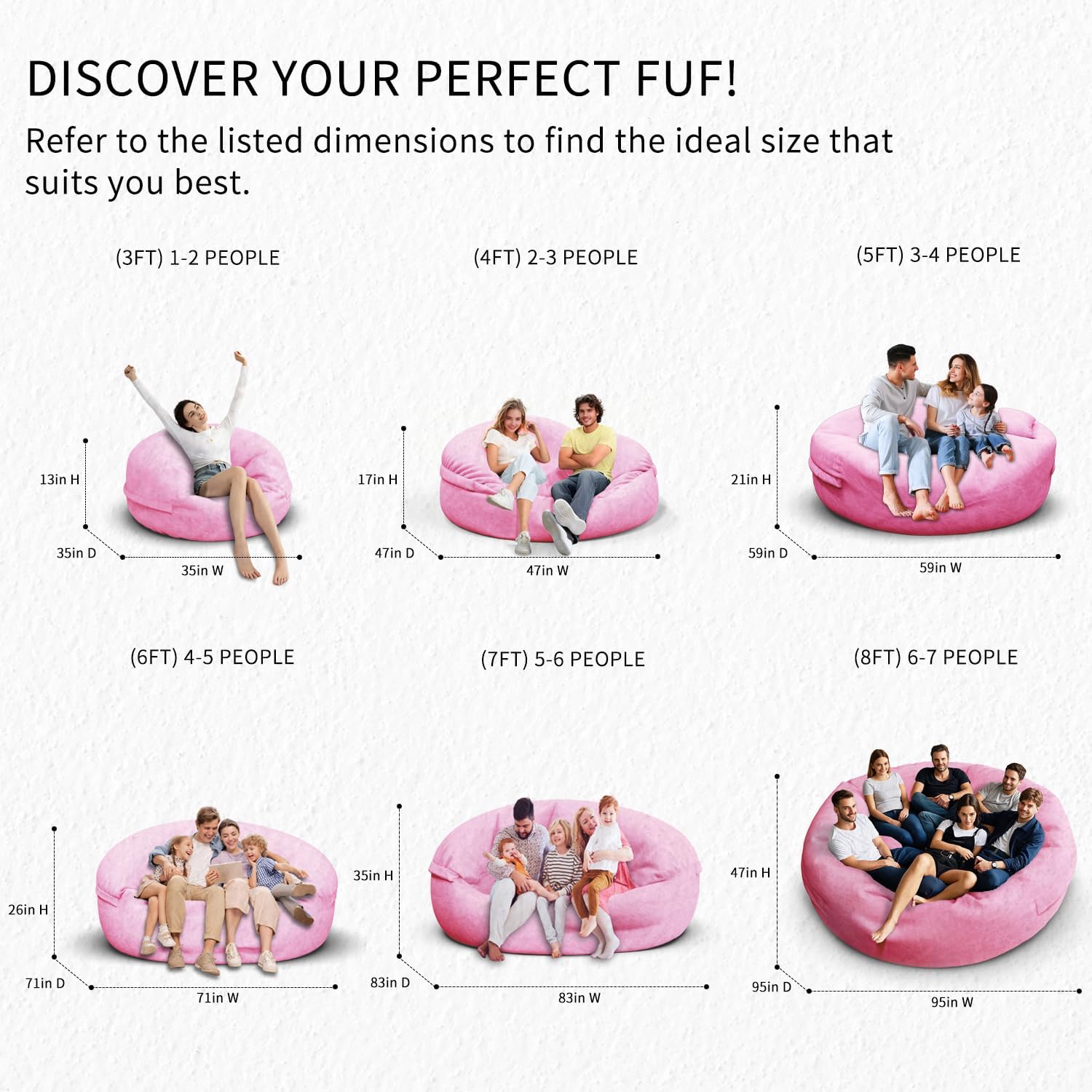 - 【Choose The Perfect Size for Your Space】 Our Bean Bag Sofa Covers Are Available In Six Sizes, From 3ft To 8ft, Catering To Both Kids And Adults.The 3ft (Capacity: 1-2 People),4ft (Capacity: 2-3 People),5ft (Capacity: 3-4 People),6ft (Capacity: 4-5 People),7ft (Capacity:5-6 People),And 8ft (Capacity:6-26 People) Options Ensure You Find The Ideal Fit.Each Size Adds A Stylish Touch To Any Space,Making Them A Versatile Addition To Your Home.