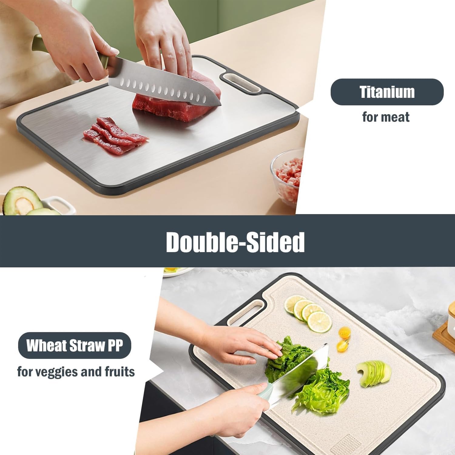 - ✅Blade-friendly design Smooth wheat straw surface minimizes edge wear on knives, and the titanium side tackles tougher ingredients without dulling your blades.