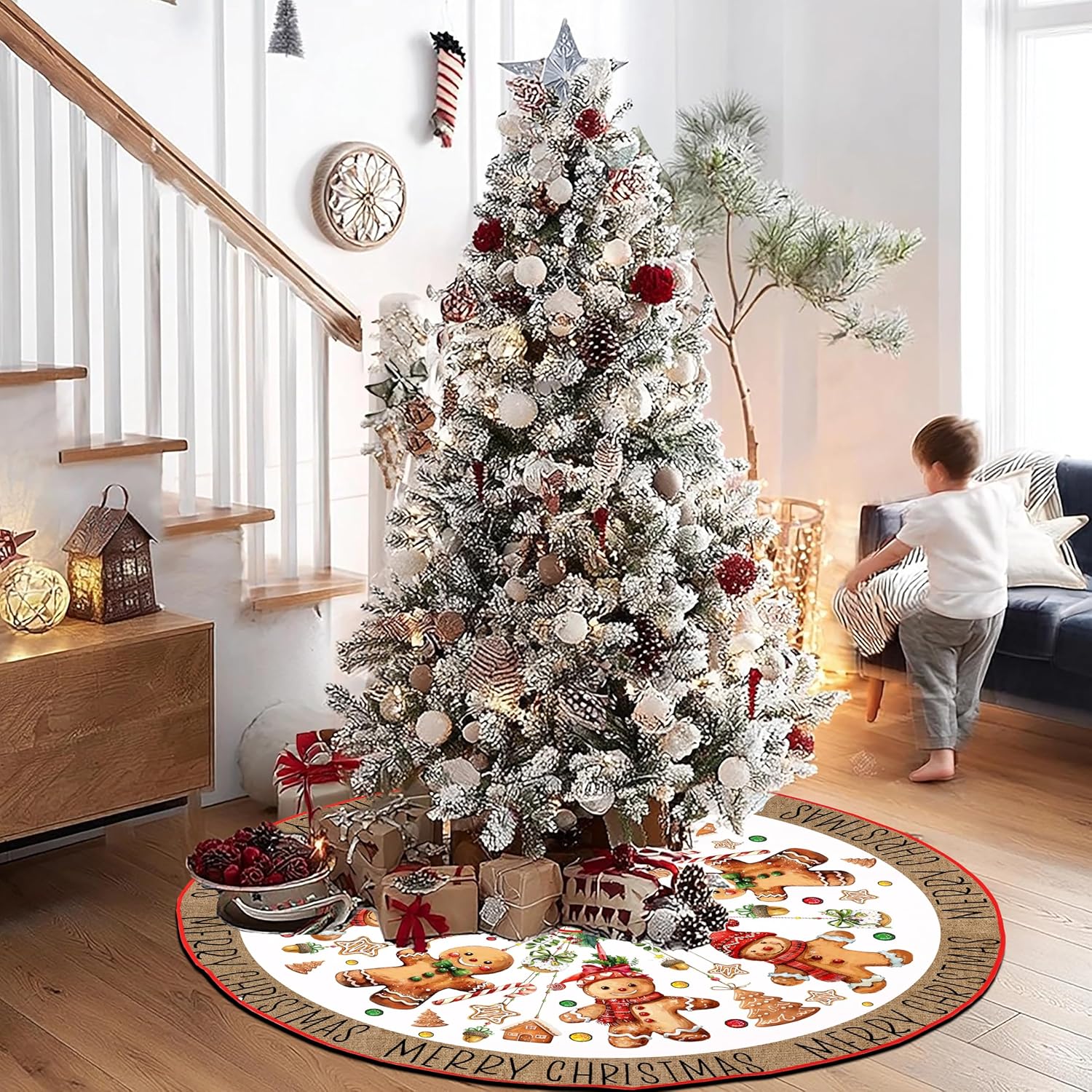 - Premium Fabric and Craftsmanship: Our Cute gingerbread man Christmas tree skirt is made of high-quality linen-like material, with a rustic and farmhouse style. The surface is soft and comfortable, and it won't scratch the floor. It also protects the floor from pine needles or sap. The pattern is beautifully printed and will not fade. The material is durable and the craftsmanship is exquisite, ensuring that it can be used for many years.