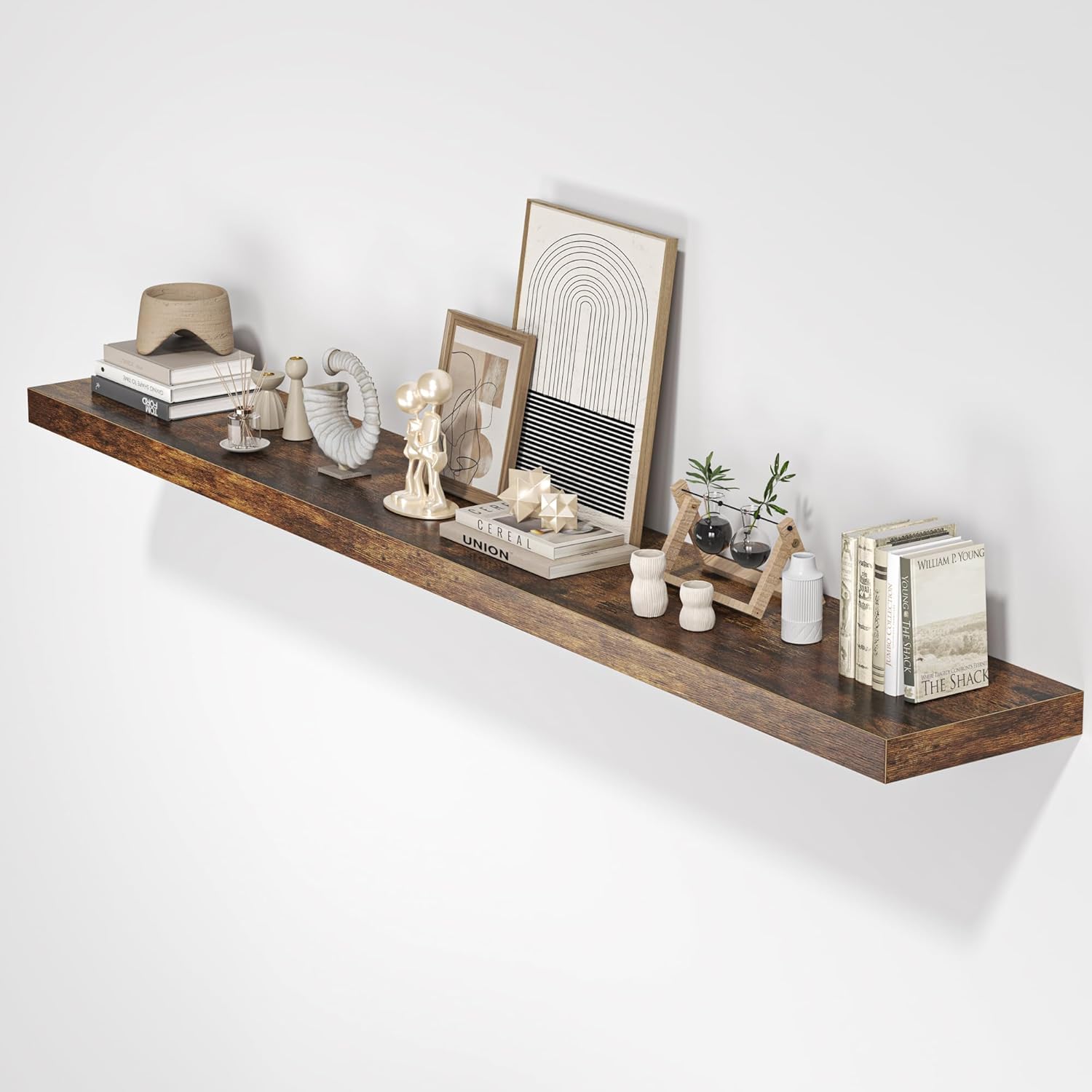 Floating Shelves for Wall, 72" W x 9.3" D x 1.5" H, Long Wooden Wall Mounted Display Shelf with Invisible Brackets for Living Room, Bedroom, Bathroom, Kitchen & Storage, Set of 1, Rustic Brown