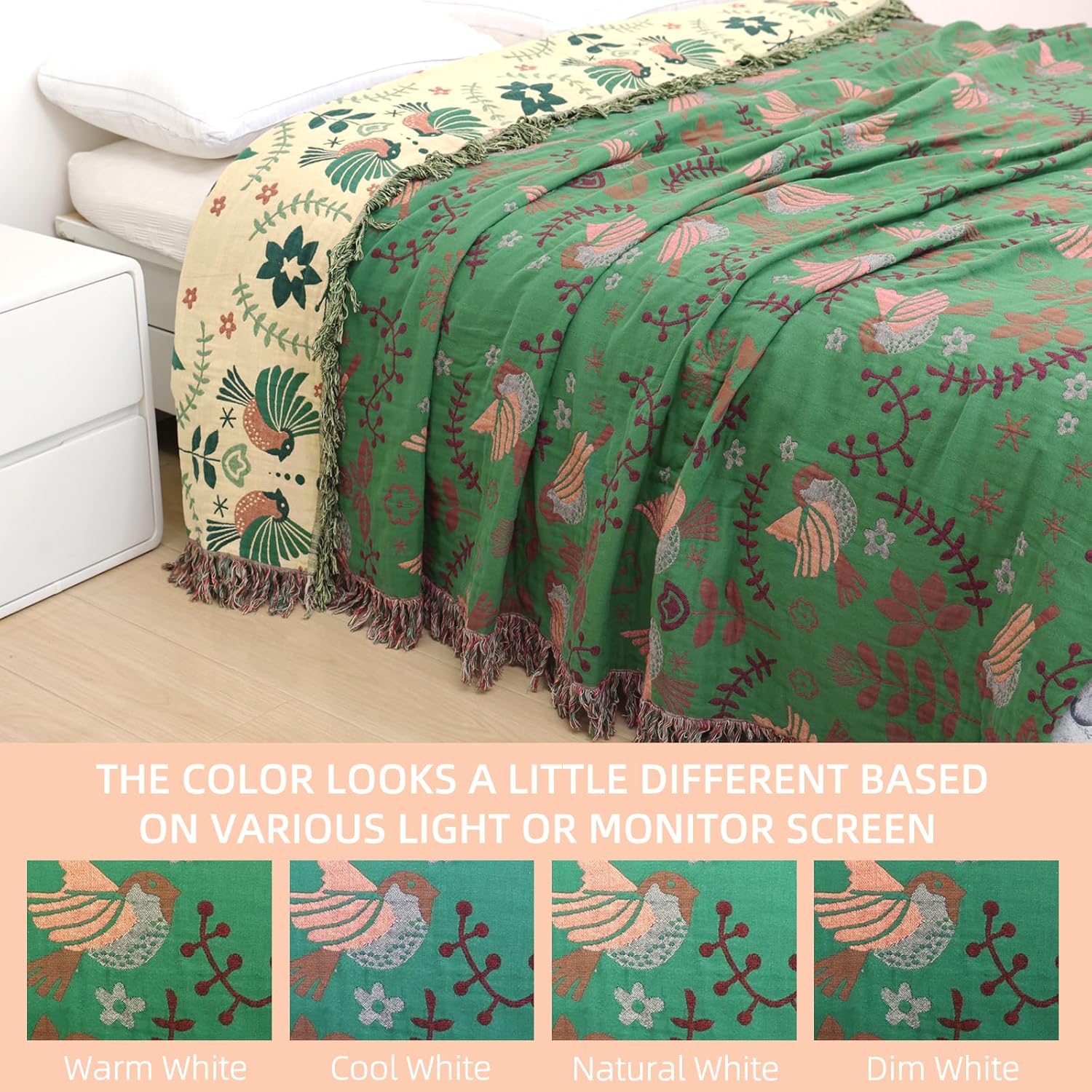 Boho Throw Blanket for Bed, 100% Pure Cotton Ultra Soft Rustic Quilt, Farmhouse Decor Bed Blankets, All Season Rustic Throw for Sofa Couch Chair(80''x 90'', Bird B)