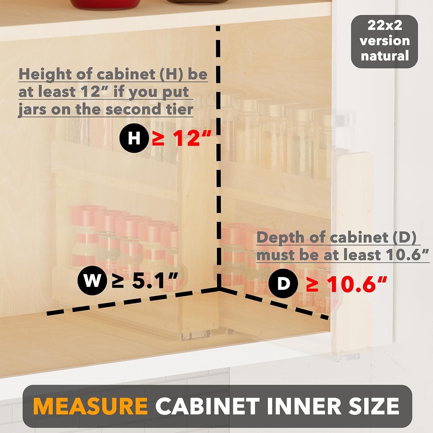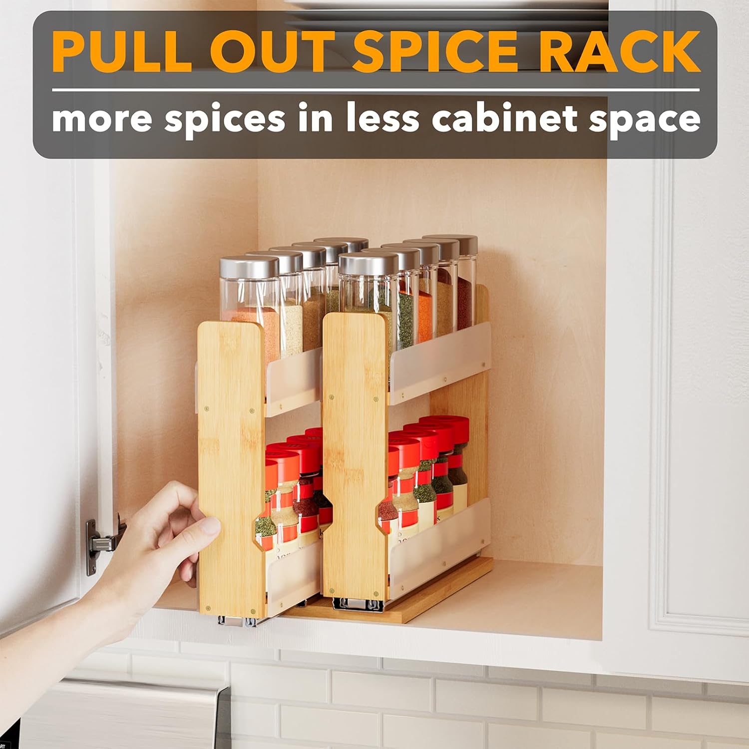- DURABLE MATERIAL TO LAST - Crafted from premium quality bamboo, this slide out seasoning organizer is built for long-lasting use; Our space-saving spice rack complement your home storage system and maximize cabinet space efficiency