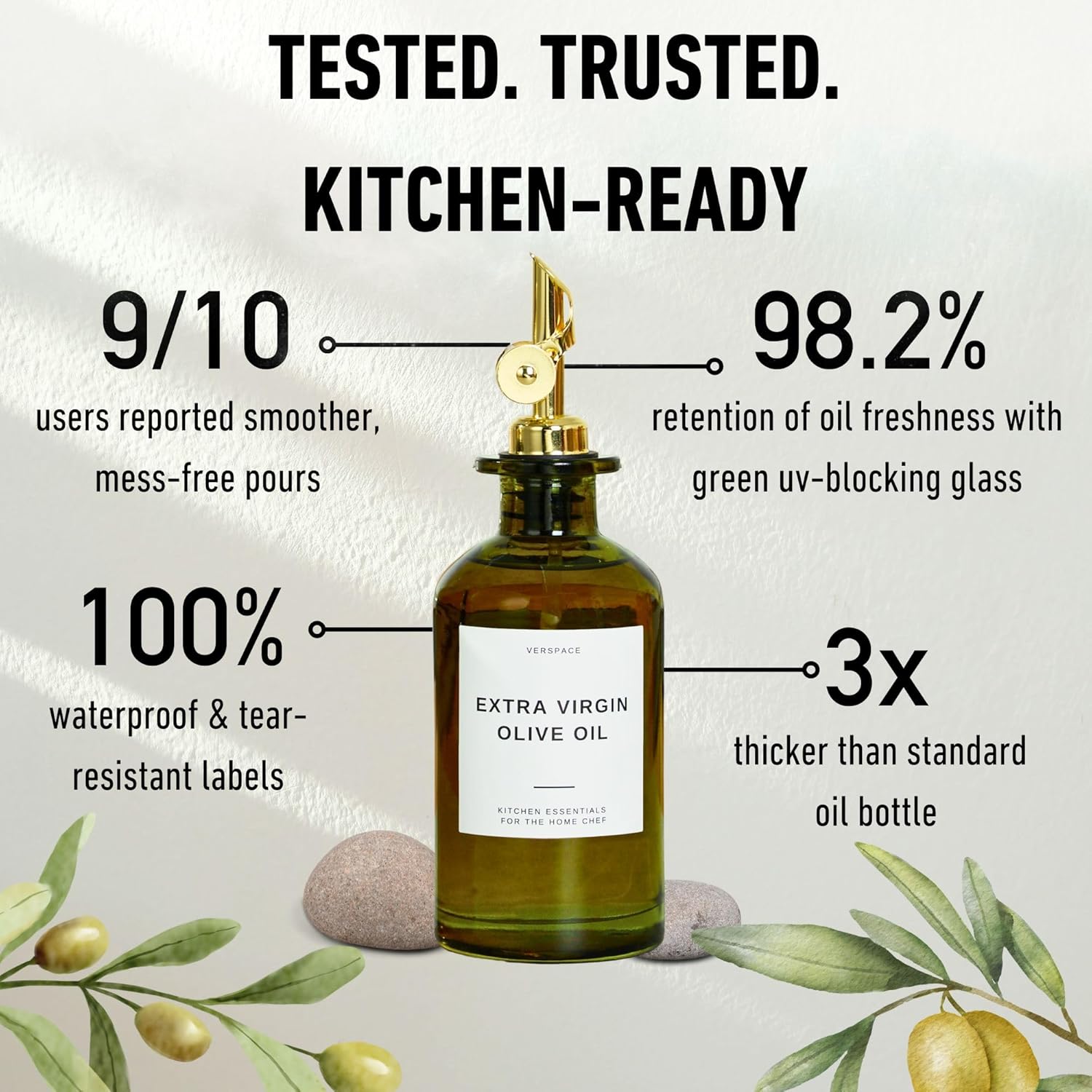 - PROTECT YOUR OIL IN STYLE: This elegant green olive oil bottle set is crafted from UV-blocking glass to preserve flavor, nutrients, and freshness. Whether you're storing extra virgin olive oil or avocado oil, your oils stay safe from sunlight and oxidation.