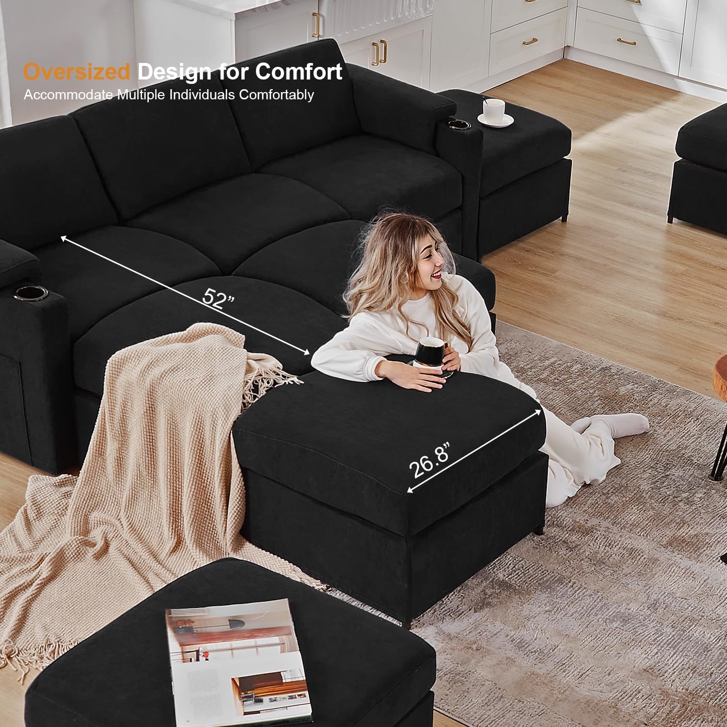 Modular Sectional Sofa Couch for Living Room Velvet Cloud Couches Oversized U Shaped Sectional Couch Convertible Sleeper Sofa Chaise Padded Armrests Cup Holder (Black, 8 Seats)