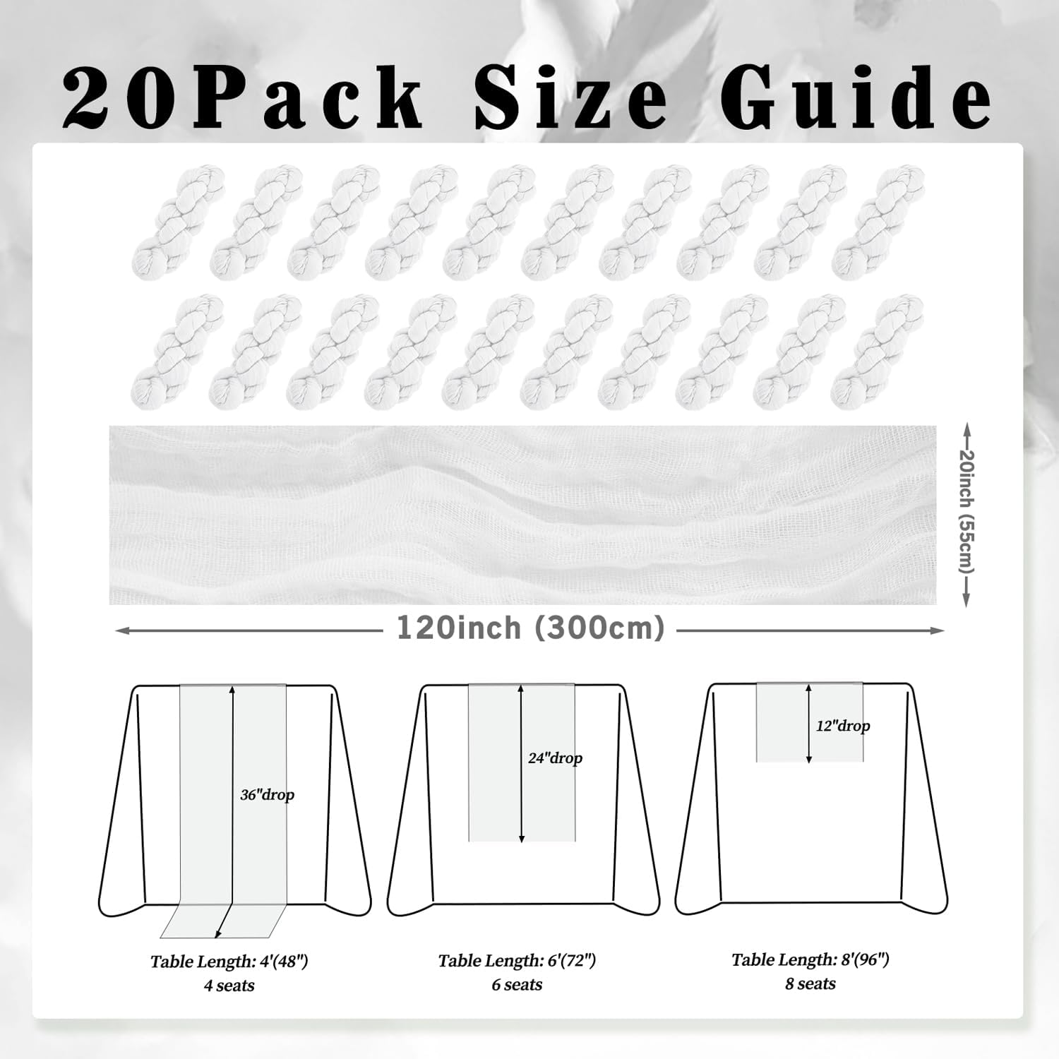 - Cheesecloth Table Runner Size: You will receive 20 white cheesecloth tablerunner, each measuring 20 x 120 inches. The quantity is sufficient for you to decorate various romantic occasions. It can decorate most shaped tables, such as rectangular tables, round tables, and cocktail tables. It is long enough to decorate a large table and be placed perfectly and elegantly on the tabletop, adding a romantic atmosphere to your occasion.