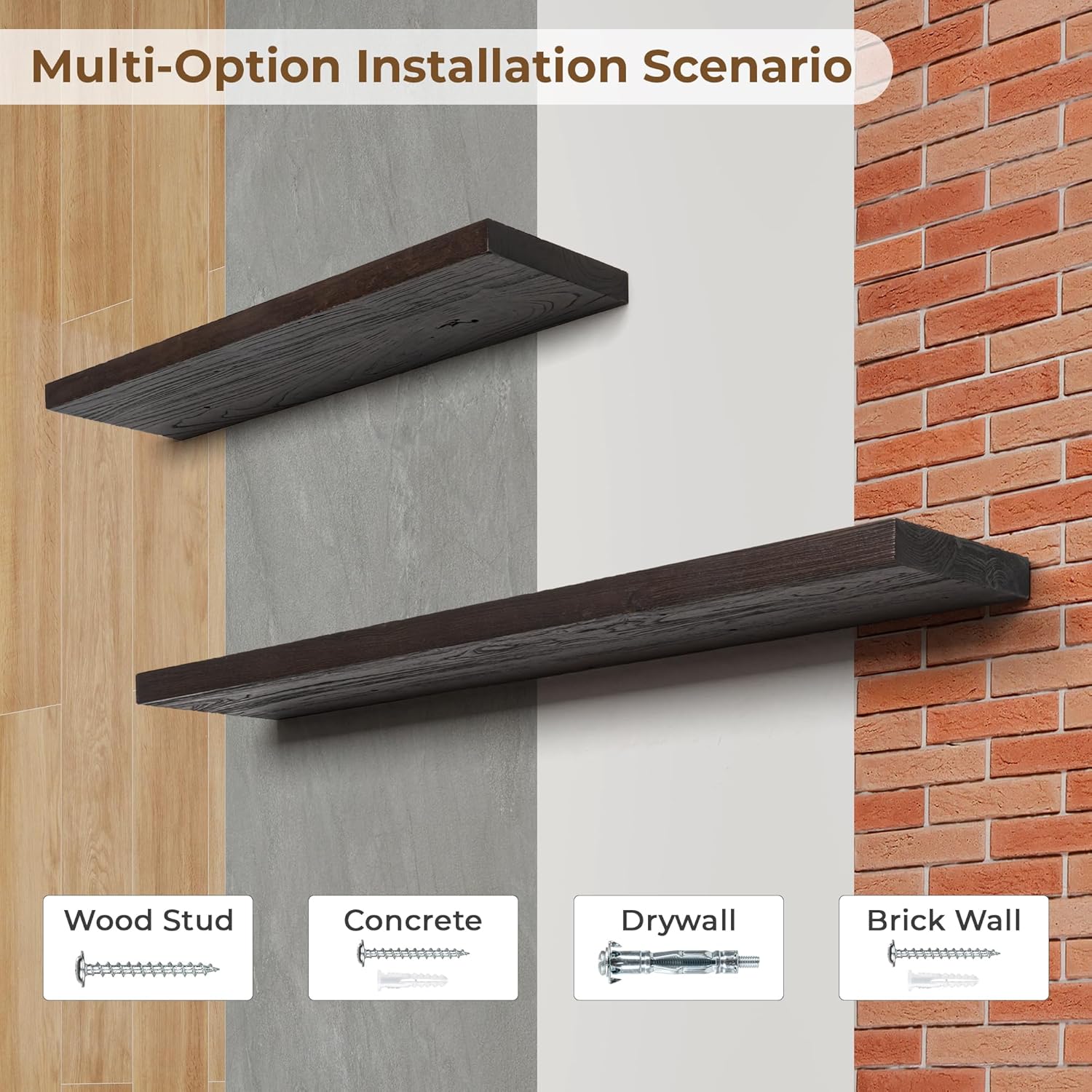 Axeman Floating Shelves for Wall - 40''W x 8'' D Rustic Solid Elm Wood Shelves for Storage, Wall Mounted Display Shelving with Invisible Heavy-Duty Metal Bracket (Walnut, 2PCs)