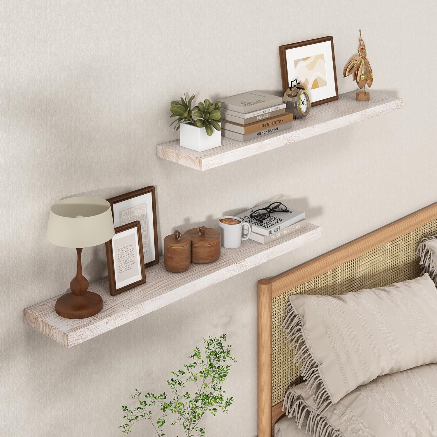 Axeman Floating Shelves for Wall - 40''W x 8'' D Rustic Solid Elm Wood Shelves for Storage, Wall Mounted Display Shelving with Invisible Heavy-Duty Metal Bracket (White Wash, 2PCs)