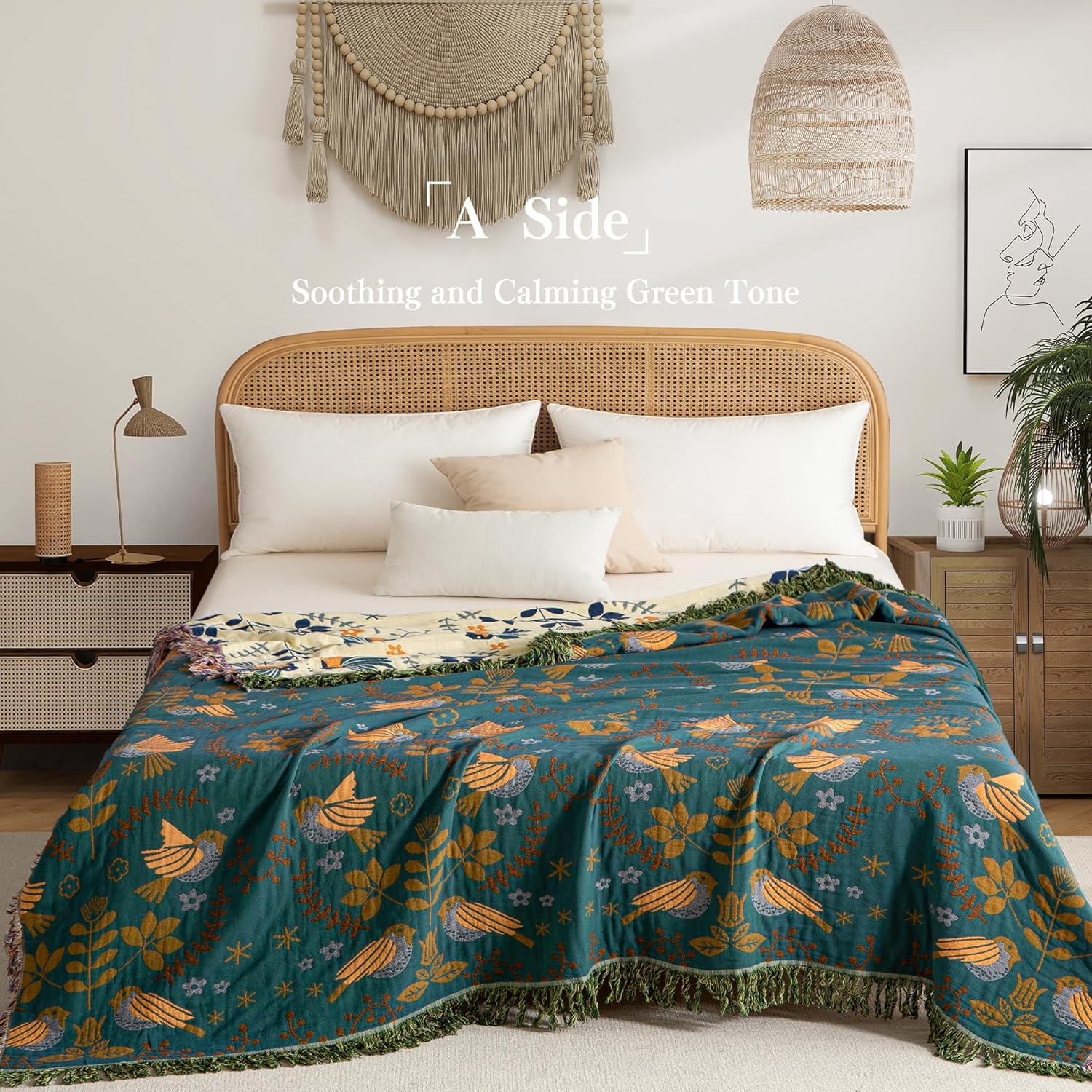 Boho Throw Blanket Twin Size, Soft Cozy Cotton Muslin Quilt Blanket for Bed Decor, Bird Patterned Couch Sofa Chair Cover, Vintage Farmhouse Cottage Tapestry Woven Blanket, Green&Beige
