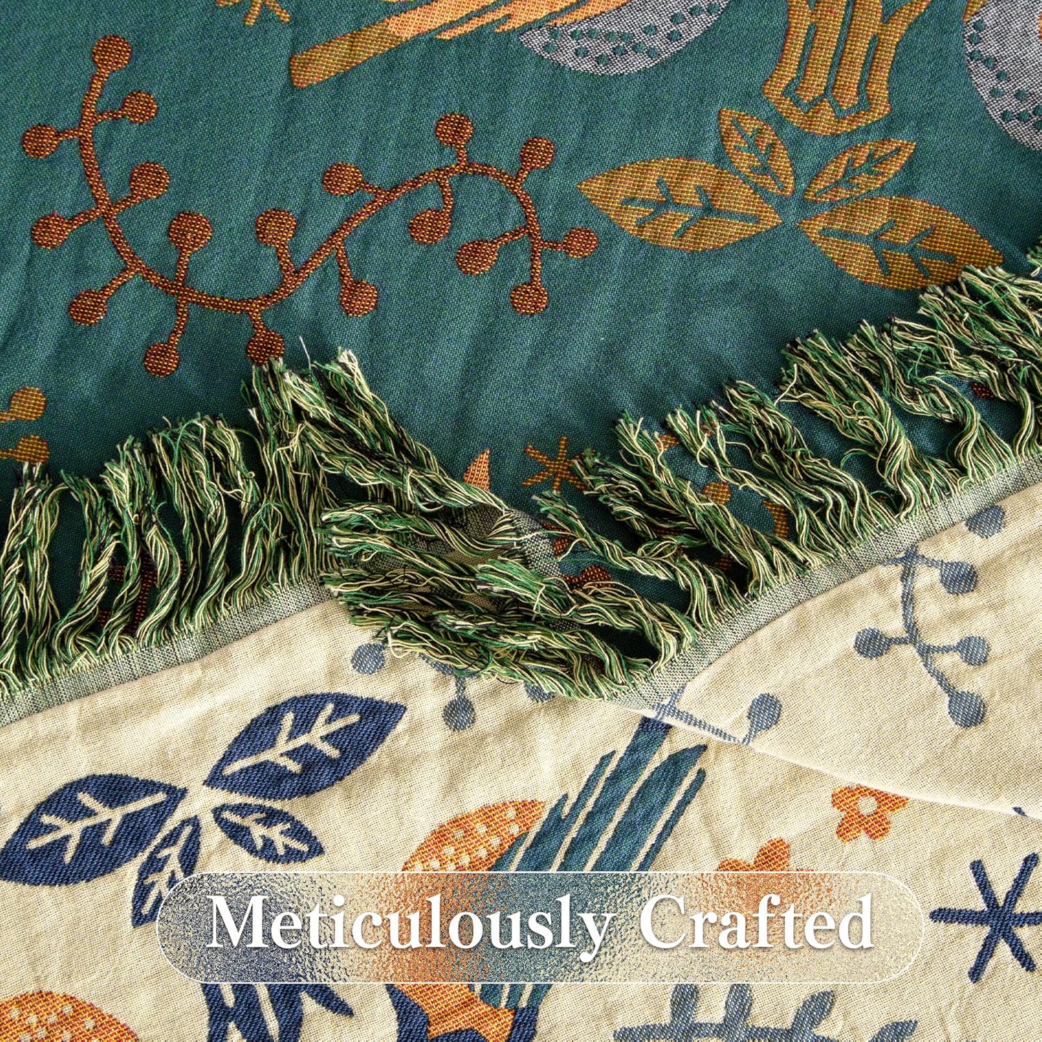 Boho Throw Blanket Queen Size, Oversized Soft Cozy Cotton Muslin Quilt Blanket for Bed Decor, Bird Patterned Couch Sofa Chair Cover, Vintage Farmhouse Cottage Woven Blanket, Green&Beige