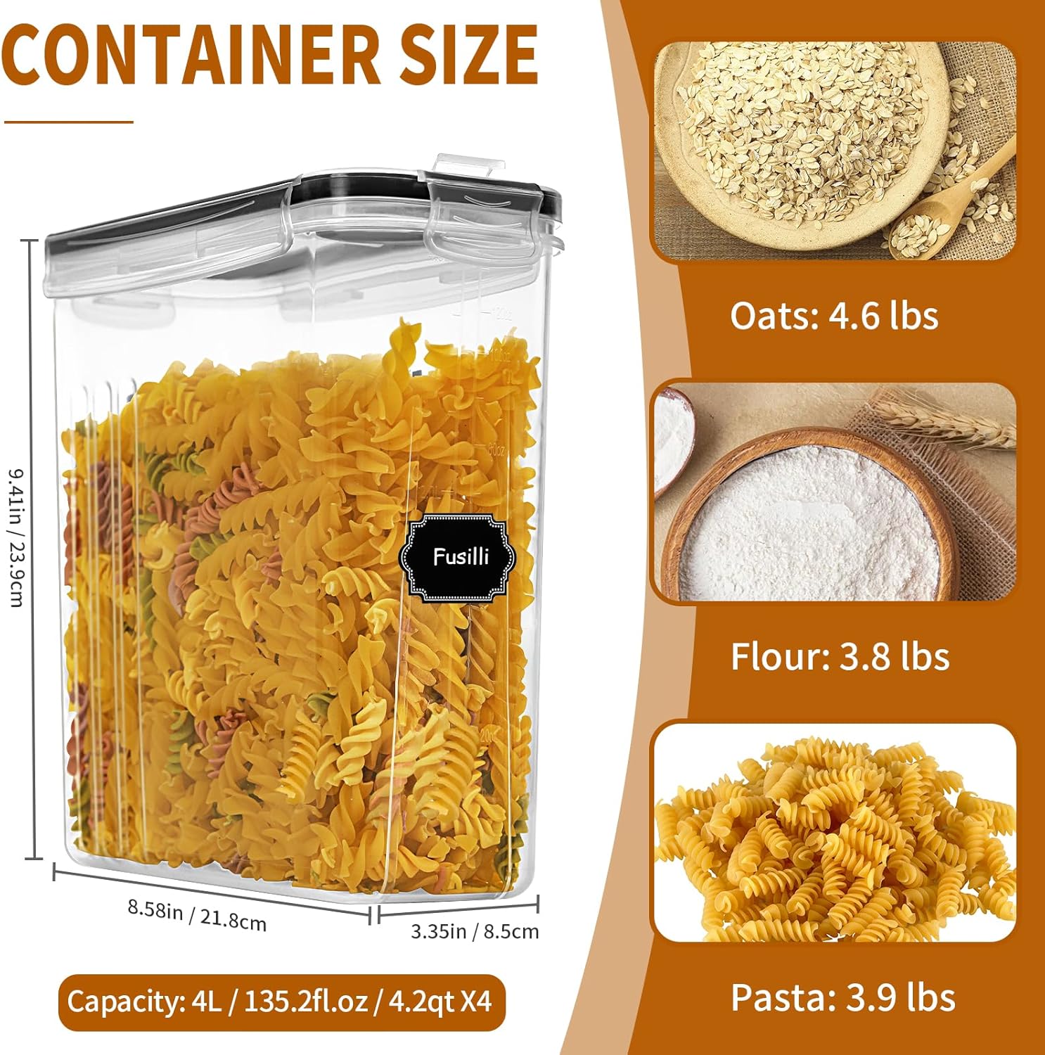 - Airtight Seal Lids: The 4 side-locking lids and flip-top in the lid are fitted with black silicone gaskets to create an airtight seal. Protecting these airtight cereal containers from air and water keeps your food fresh and dry, helping you to store food for longer periods of time