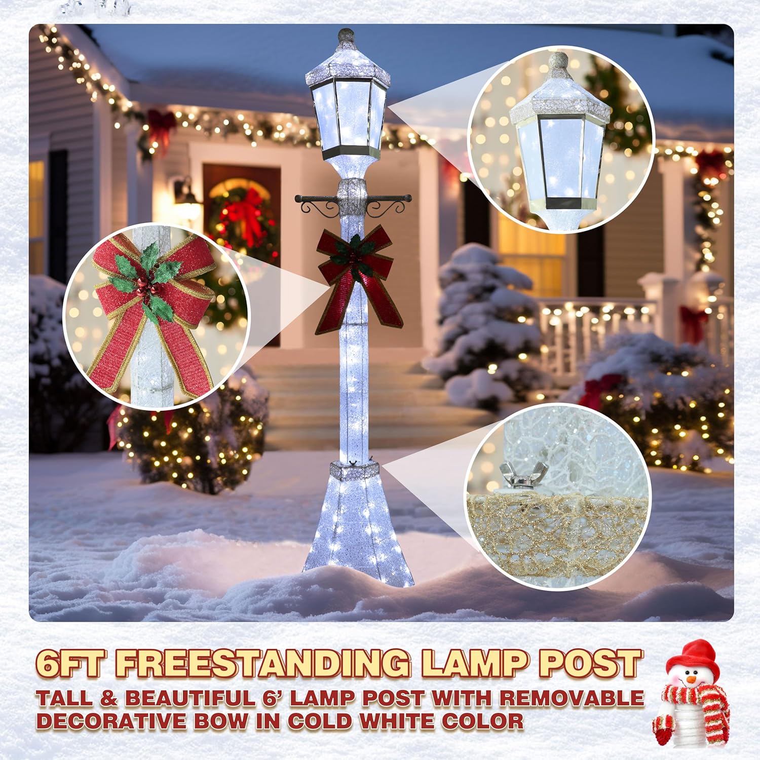 - 6FT Christmas Lamp Post - Brighten your holiday atmosphere! This 6ft tall lamp post becomes a focal point whether placed in empty indoor corners or on outdoor porches and courtyard entrances. Featuring a removable bow decoration, the Christmas light post adds rich festive charm to the Christmas season. Its elegant design easily adapts to diverse occasions like parties and dinners, as if transporting you into a romantic holiday movie and infusing every moment with a sense of ritual