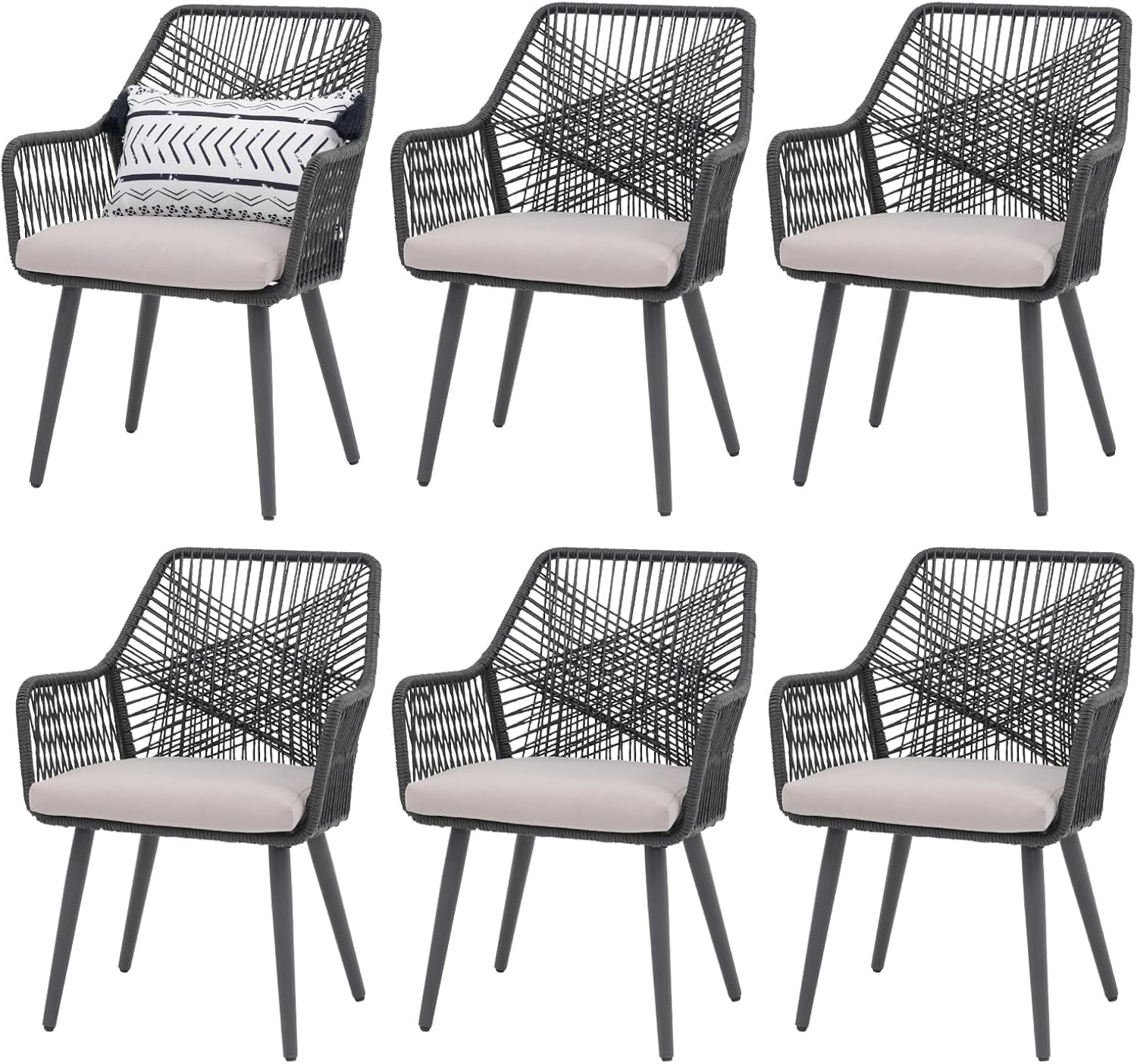 Patiorama Patio Dining Chair Set of 6, Woven Rope Outdoor Dining Chairs w/Steel Frame, All-Weather Twisted Rattan Chairs w/Armrest & Cushion, Outdoor Dining Wicker Chairs for Backyard Garden(Black)
