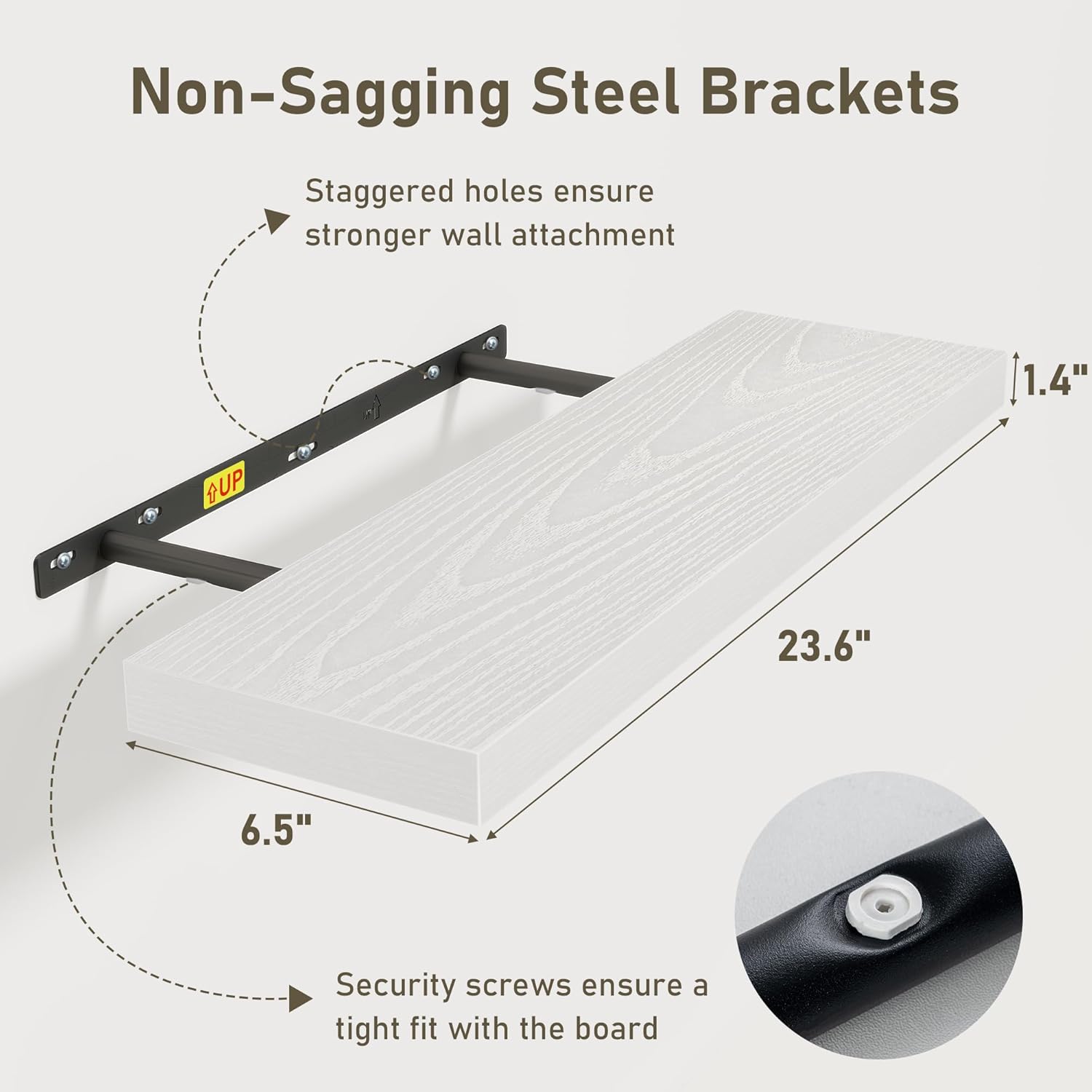 - 24 Inch Floating Shelves for Wall (Set of 3): Each wall shelves are 6.7 inches in depth and 1.4 inches in thickness. 3-piece set is more cost-effective and practical. Our wall shelf can be used in combination, staggered high or low on the wall, or mounted side-by-side to provide extra storage space for organizing small items and clutter in multiple areas such as kitchens, bathrooms, and bedrooms, creating a clean and smooth look. Multiple colors available