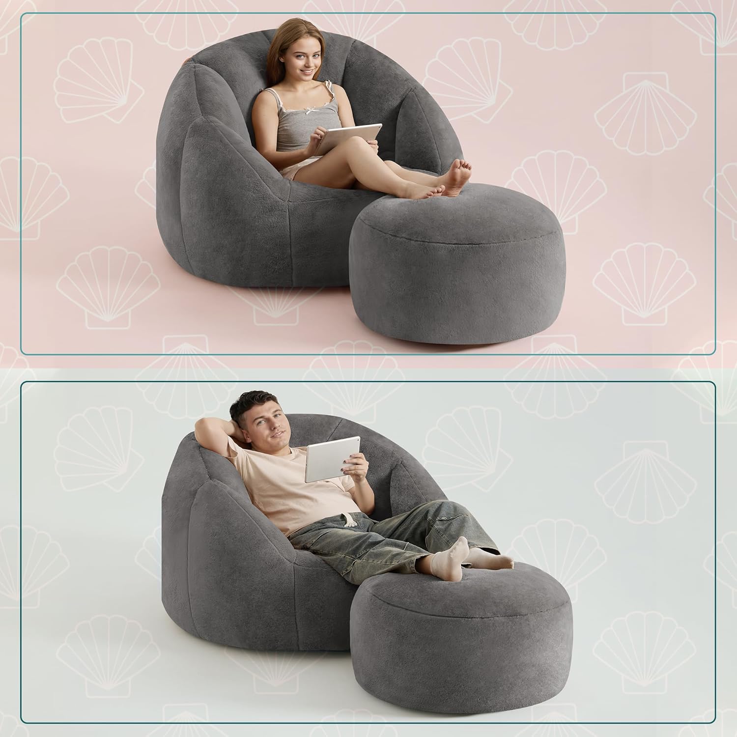 Giant Bean Bag Chaise Lounge Indoor Chair for Adults - Comfy Plush Round Shell Soft Accent Chair, Oversized Cozy Floor Sofa for Living Room, Bedroom & Game Rooms, Gray