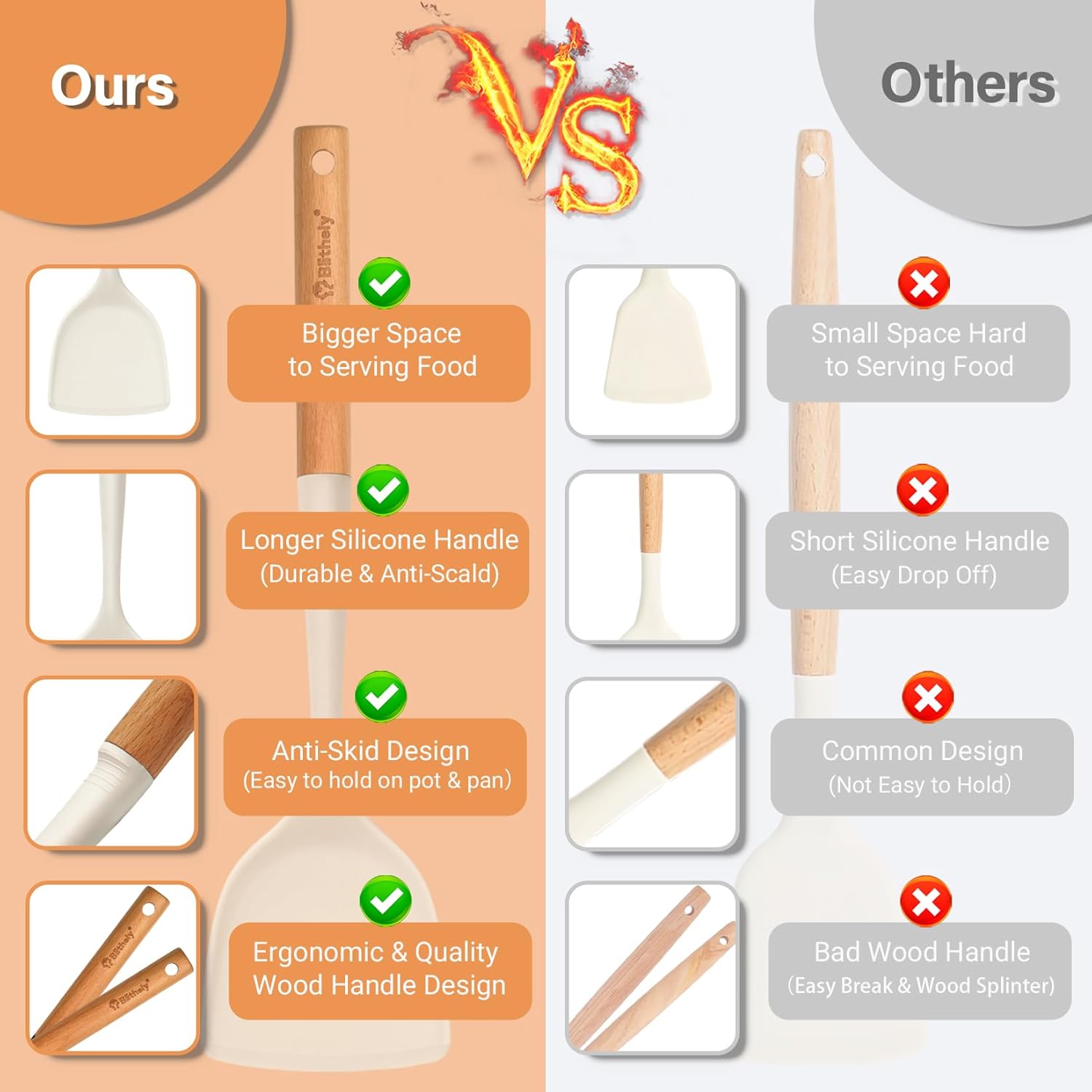 - 🏆【Easy to Clean & Attention】Our silicone utensil set have smooth surface which is easy to clean. Attention: This product comes with a natural wood handle. Please do not soak it in water for a long time or use a dishwasher. Avoid using a hard or abrasive dishwashing brush to clean the wooden handle. It is recommended to clean it by hand with clean water or gently wipe it with a soft cloth. Make sure the wooden handle is completely dry before storage.