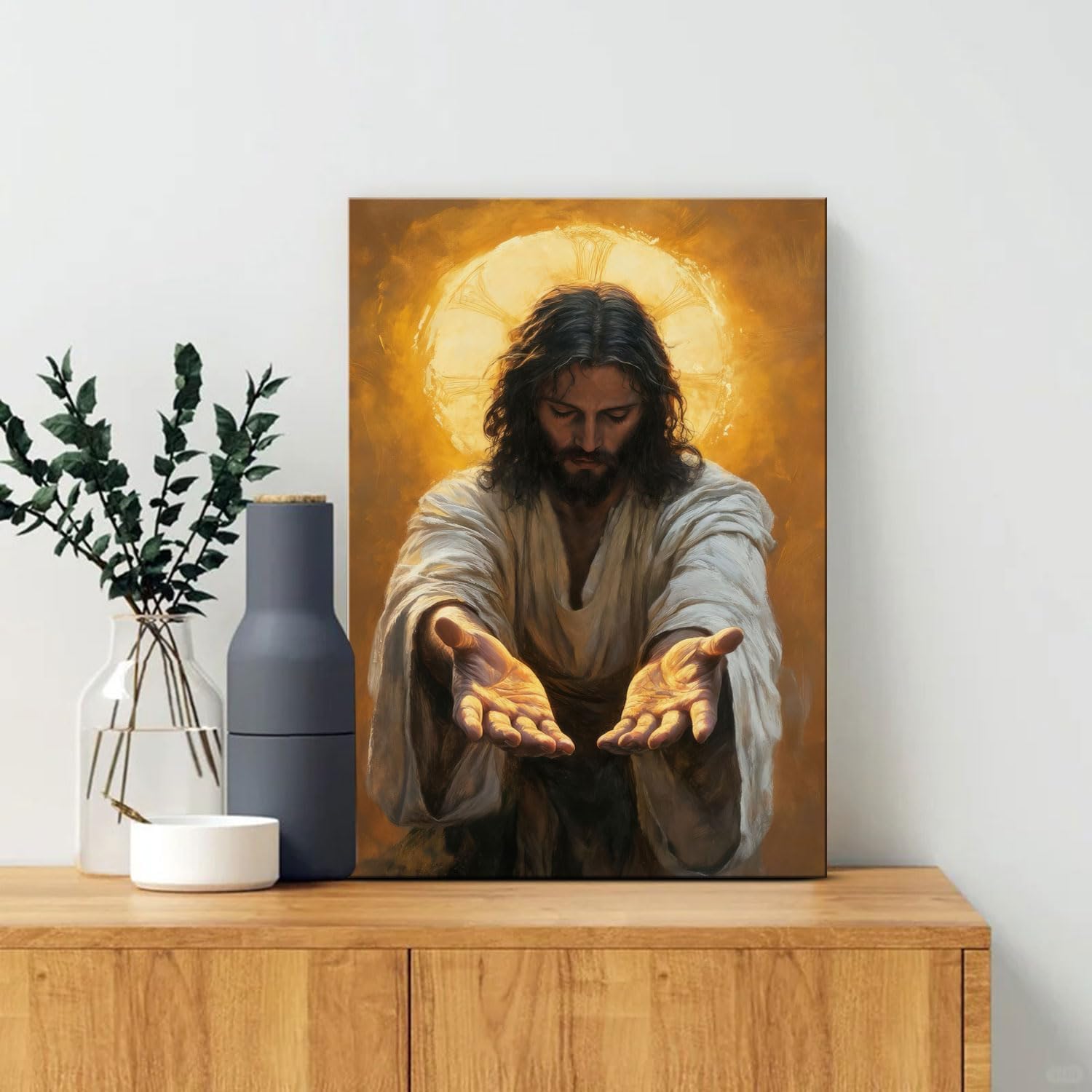 - Spiritual Christian Wall Art This 16x24 inch framed canvas print features a powerful image of Jesus Christ reaching out with open hands, set against a radiant golden halo, bringing a sense of peace and divine presence to any room.
