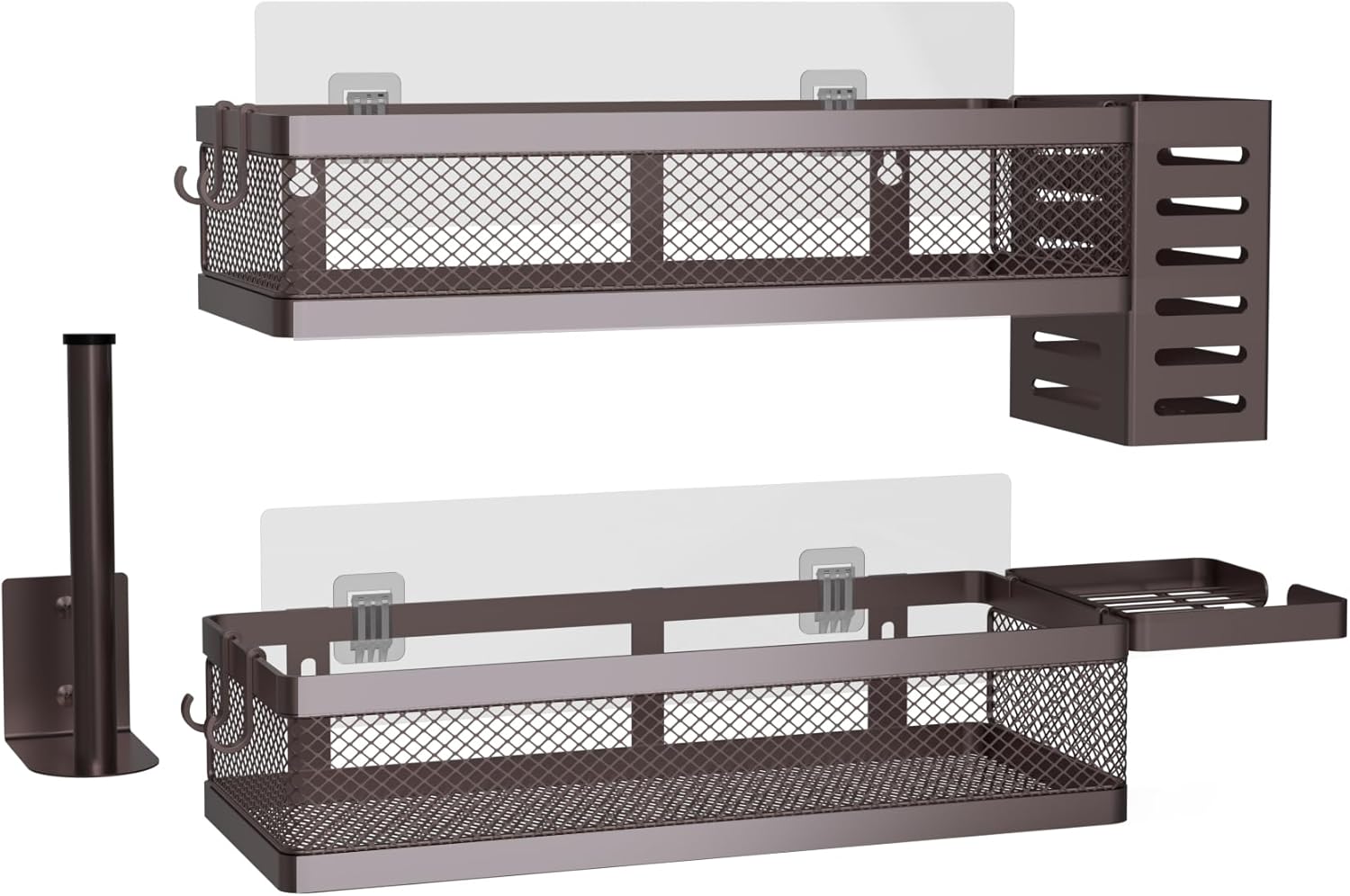 - ăMULTI-PURPOSE&MULTIFUNCTIONALă5 Hanging Storage Baskets Organizer Set for Sufficient Bathroom Kitchen Storage Space, The bathroom&Kitchen organizer comes with 5 pieces for different uses, including 2 Hanging Storage Baskets, 1 soap holder,1 Tissue holder ,1 utensil holder and 2 adhesives. The perfect solution for organizing a multitude of every items indoor or outdoor. The cabinet organizer hanging baskets wall mount is Ideal for organizing and storing spice bottles, pantry items, snacks, toiletries, tools, craft supplies,etc. And this metal bin basket free up enough space for your homes, kitchen, living room, bathroom, camper, farmhouse, apartments, college dorm rooms, etc.
