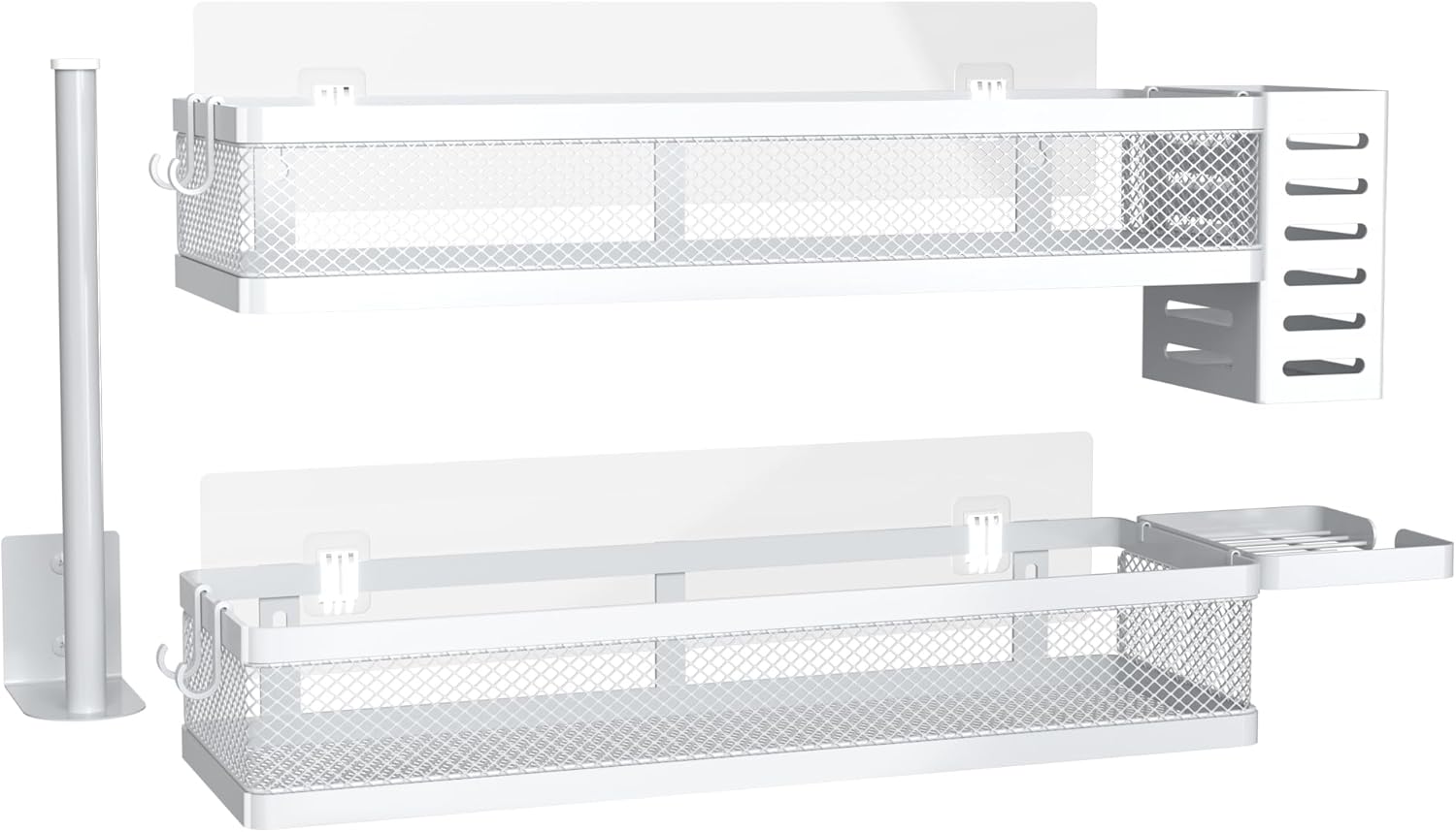 - Included Components : 1 Soap Holder, 1 Tissue Holder, 1 Utensil Holder, 2 Adhesives, 2 Hanging Storage Baskets