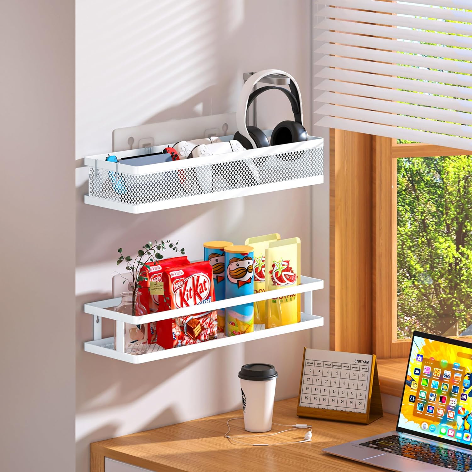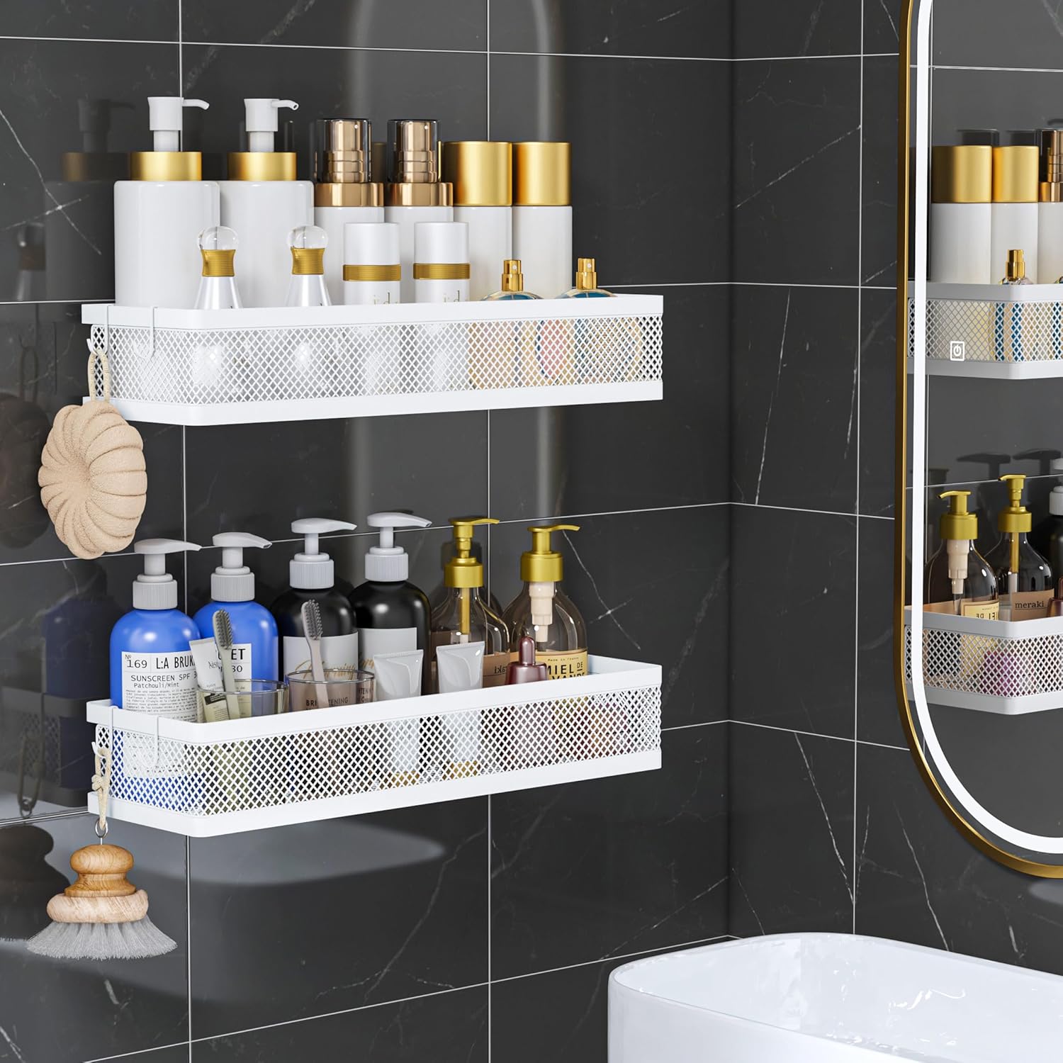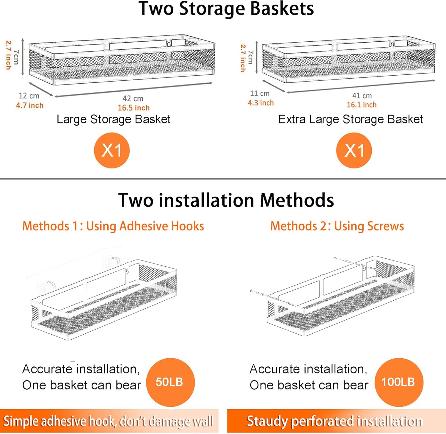 - ăMULTI-PURPOSE&MULTIFUNCTIONALă5 Hanging Storage Baskets Organizer Set for Sufficient Bathroom Kitchen Storage Space, The bathroom&Kitchen organizer comes with 5 pieces for different uses, including 2 Hanging Storage Baskets, 1 soap holder,1 Tissue holder ,1 utensil holder and 2 adhesives. The perfect solution for organizing a multitude of every items indoor or outdoor. The cabinet organizer hanging baskets wall mount is Ideal for organizing and storing spice bottles, pantry items, snacks, toiletries, tools, craft supplies,etc. And this metal bin basket free up enough space for your homes, kitchen, living room, bathroom, camper, farmhouse, apartments, college dorm rooms, etc.