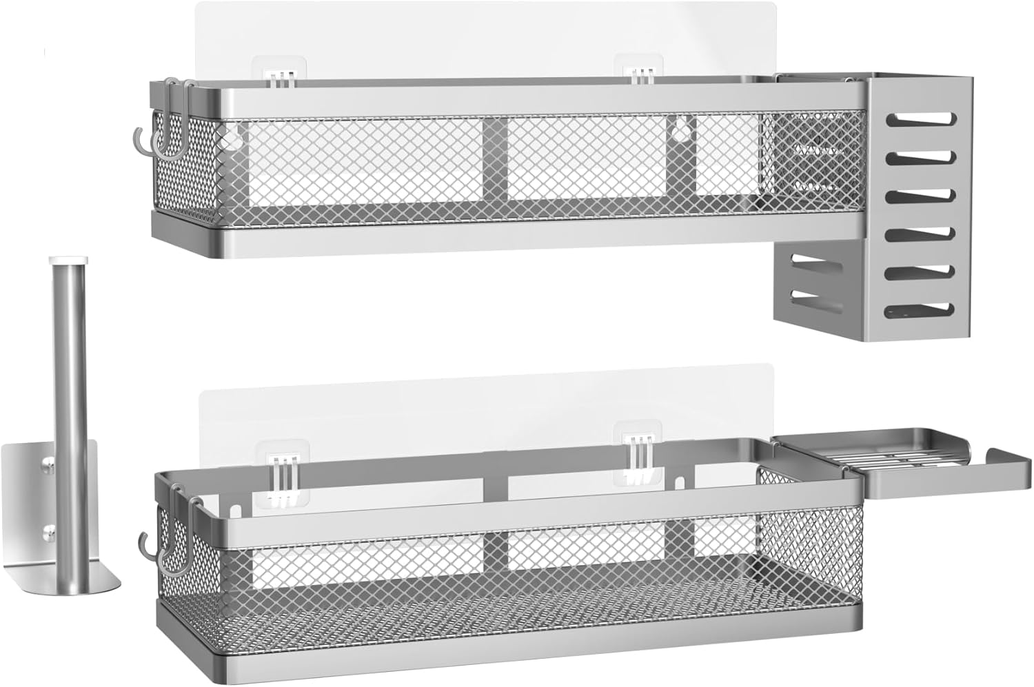 - ăMULTI-PURPOSE&MULTIFUNCTIONALă5 Hanging Storage Baskets Organizer Set for Sufficient Bathroom Kitchen Storage Space, The bathroom&Kitchen organizer comes with 5 pieces for different uses, including 2 Hanging Storage Baskets, 1 soap holder,1 Tissue holder ,1 utensil holder and 2 adhesives. The perfect solution for organizing a multitude of every items indoor or outdoor. The cabinet organizer hanging baskets wall mount is Ideal for organizing and storing spice bottles, pantry items, snacks, toiletries, tools, craft supplies,etc. And this metal bin basket free up enough space for your homes, kitchen, living room, bathroom, camper, farmhouse, apartments, college dorm rooms, etc.