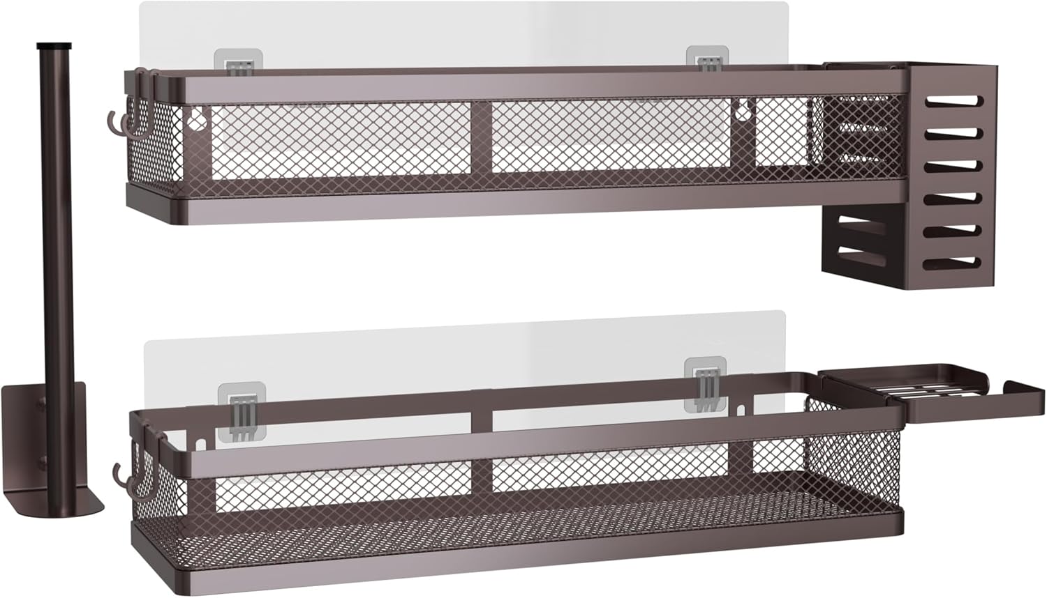 - Included Components : 1 Soap Holder, 1 Tissue Holder, 1 Utensil Holder, 2 Adhesives, 2 Hanging Storage Baskets