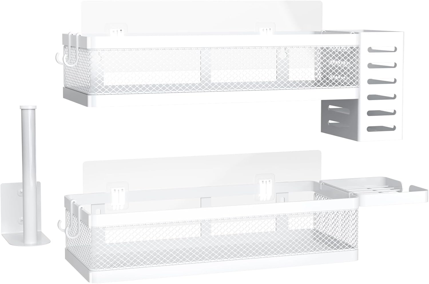 - 【MULTI-PURPOSE&MULTIFUNCTIONAL】5 Hanging Storage Baskets Organizer Set for Sufficient Bathroom Kitchen Storage Space, The bathroom&Kitchen organizer comes with 5 pieces for different uses, including 2 Hanging Storage Baskets, 1 soap holder,1 Tissue holder ,1 utensil holder and 2 adhesives. The perfect solution for organizing a multitude of every items indoor or outdoor. The cabinet organizer hanging baskets wall mount is Ideal for organizing and storing spice bottles, pantry items, snacks, toiletries, tools, craft supplies,etc. And this metal bin basket free up enough space for your homes, kitchen, living room, bathroom, camper, farmhouse, apartments, college dorm rooms, etc.