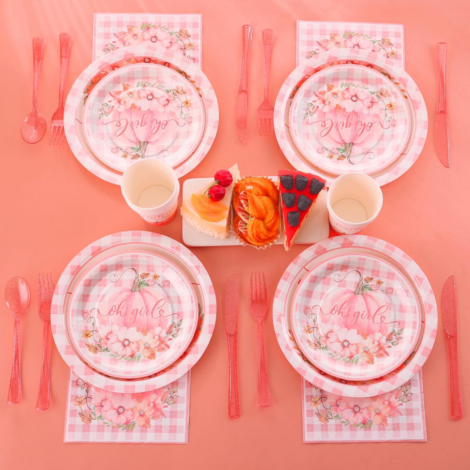 - 【Pumpkin Themed Baby Shower】- A sweet little pumpkin is on the way girl include 24 9 inch pumpkin baby shower plates, 24 7-inch a fall baby shower plates, 24 little pumpkin cups, 24 2-ply little pumpkin napkins, 24 sets of pink plastic utensils (forks, spoons, knives), 168 pieces in total. This is a great fall baby shower plates and napkins sets.