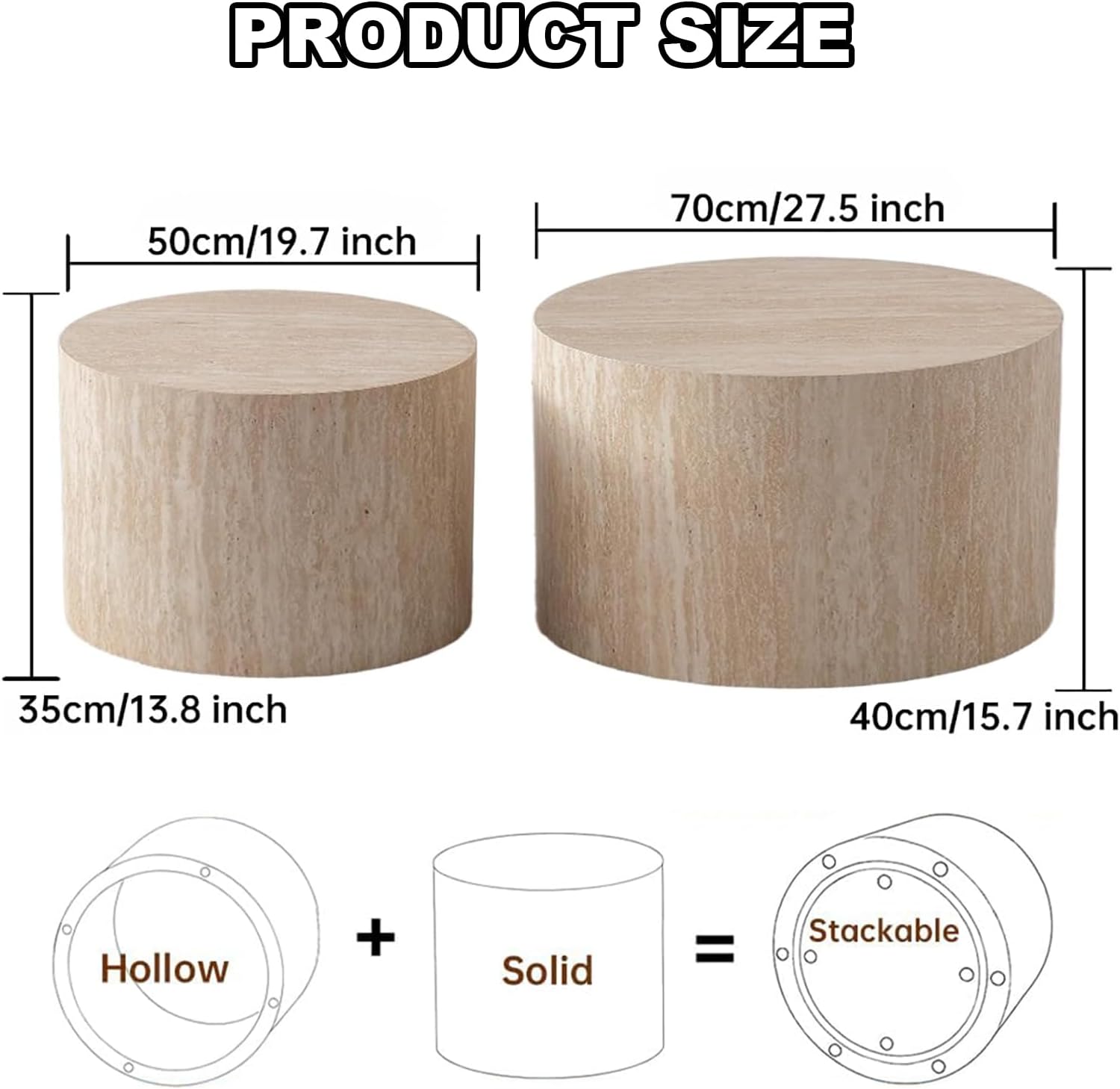 Round Nesting Coffee Table Set of 2, Modern Coffee and End Table Set Small Circle Wooden Drum Side Table Accent End Tables for Living Room Office, No Assembly,Travertine Large