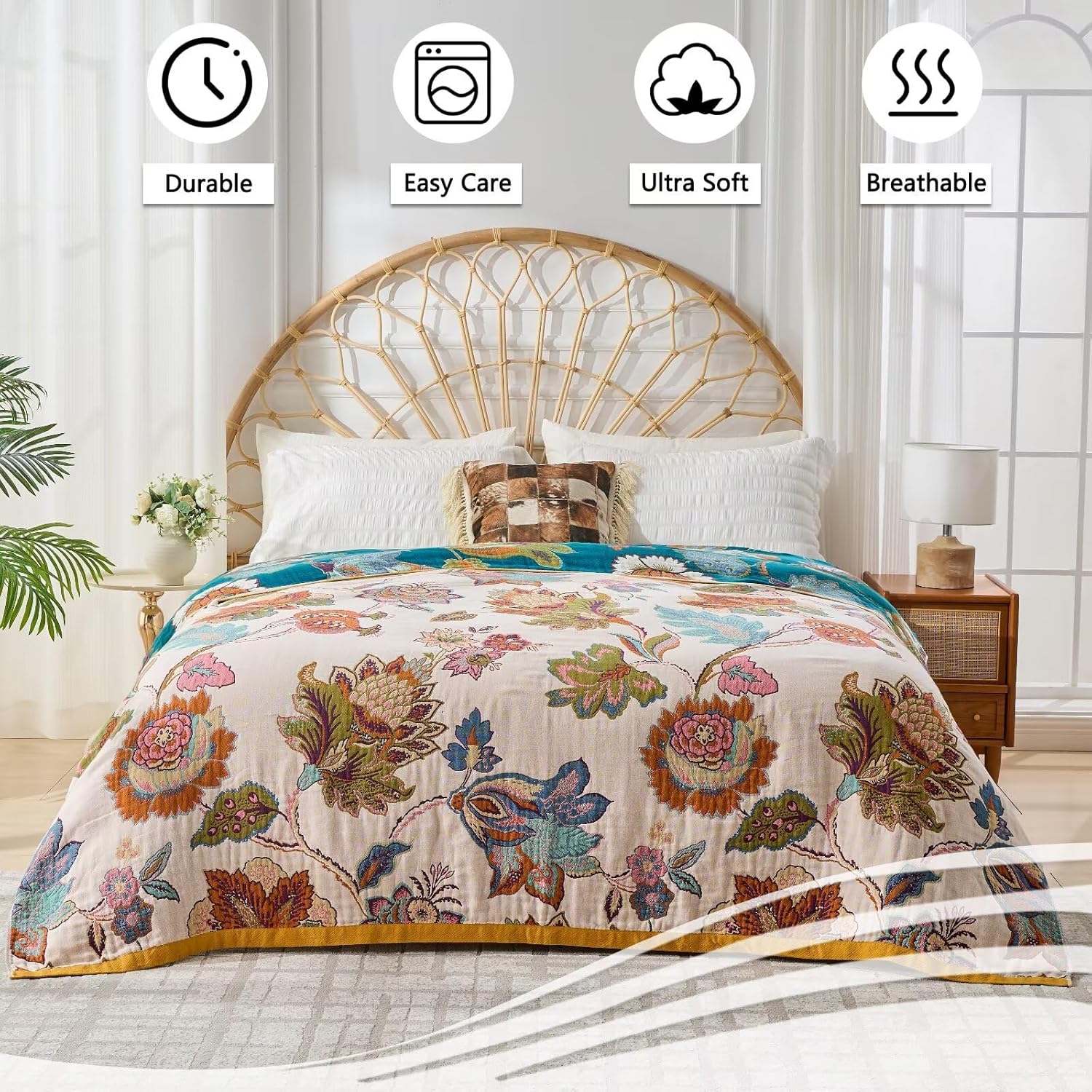 - Multi-functional Boho Throw Blanket: This multi-purpose cotton quilt is perfect for any setting. Use it as a bedspread, chic couch cover, fall blanket, travel blanket, or lightweight summer quilt. The rustic elegance of this boho throw blanket adds charm to any decor setting.