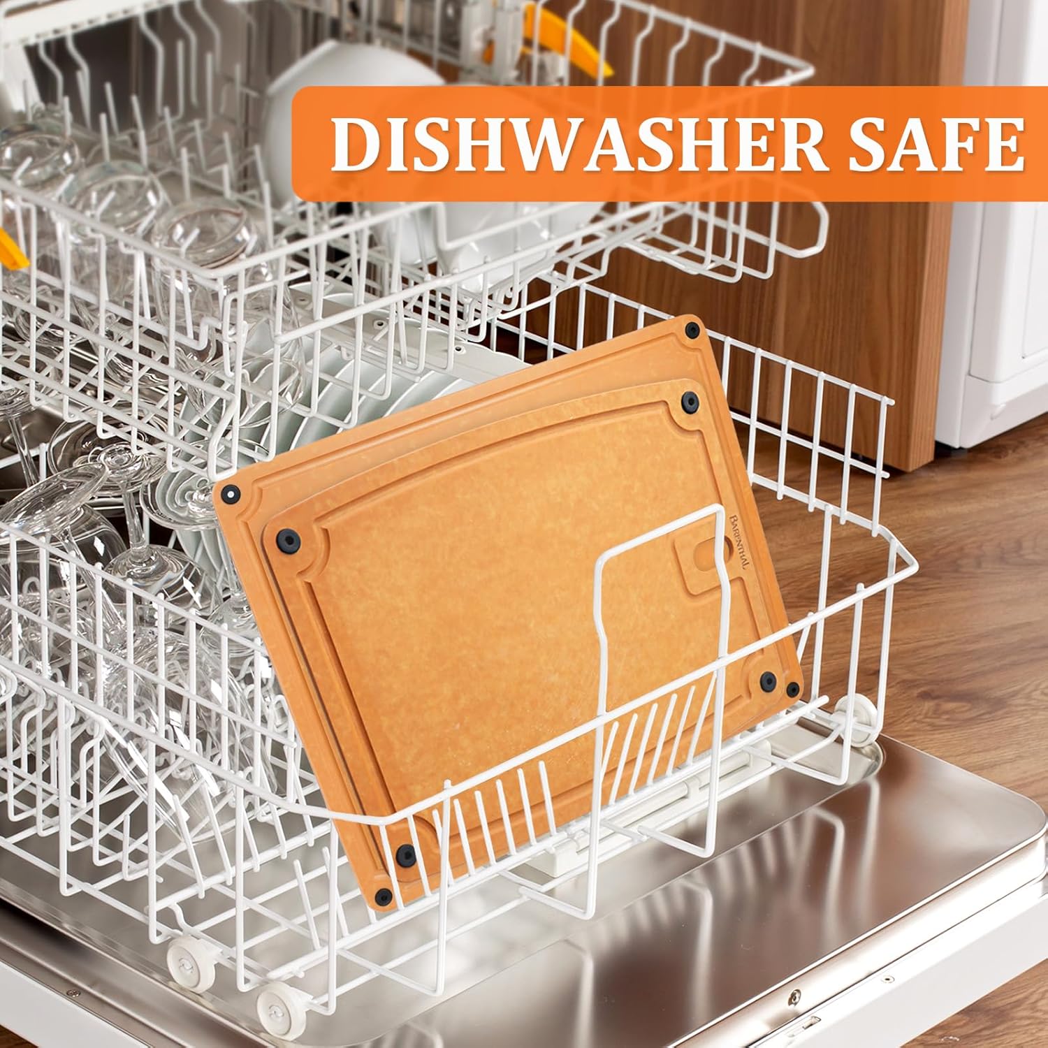 - โ [๐ซ๐๐๐๐๐๐๐๐๐ ๐บ๐๐๐] : Crafted from natural composite material, this cutting board resists warping and crackingโeven in the dishwasher! For longevity, we recommend the quick wash model when use dishwasher. [๐๐ฉ๐ช๐ง๐๐ฎ ๐๐ช๐ฉ๐ฉ๐๐ฃ๐ ๐๐ค๐๐ง๐] : thanks to its natural composite material , it makes the cutting board durable, knife friendly, keep new. Not like bamboo/wooden or plastic chopping boards that get moldyใwarp and crack after a long time.