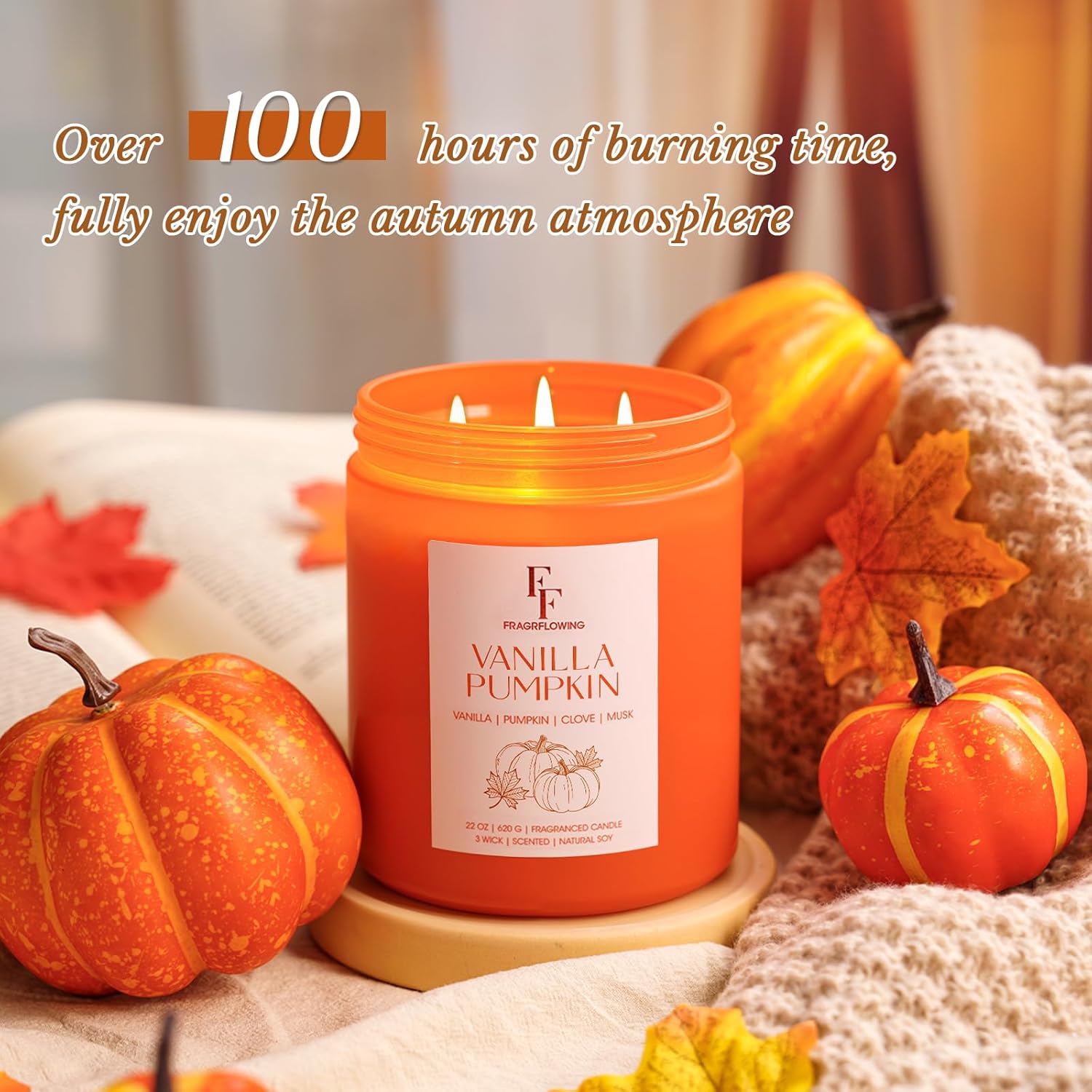 Large Fall Candle Vanilla Pumpkin Scented, 3-Wick 22oz Long Lasting Scented Candle, Natural Soy Wax Aromatherapy Candle for Home, Autumn Candle Gifts for Women Men