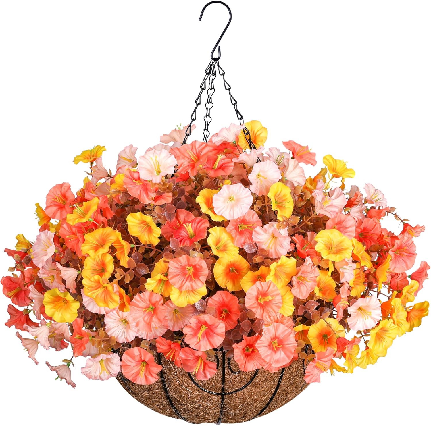 - Artificial Hanging Flowers Basket with Morning Glory: Package include 12 bundles realistic silk morning glory match with green eucalyptus leaves, 1 Hanging Basket with chain, 1 foam, 1 green hat. Enjoy vibrant blooms year-round, regardless of the season or weather conditions.