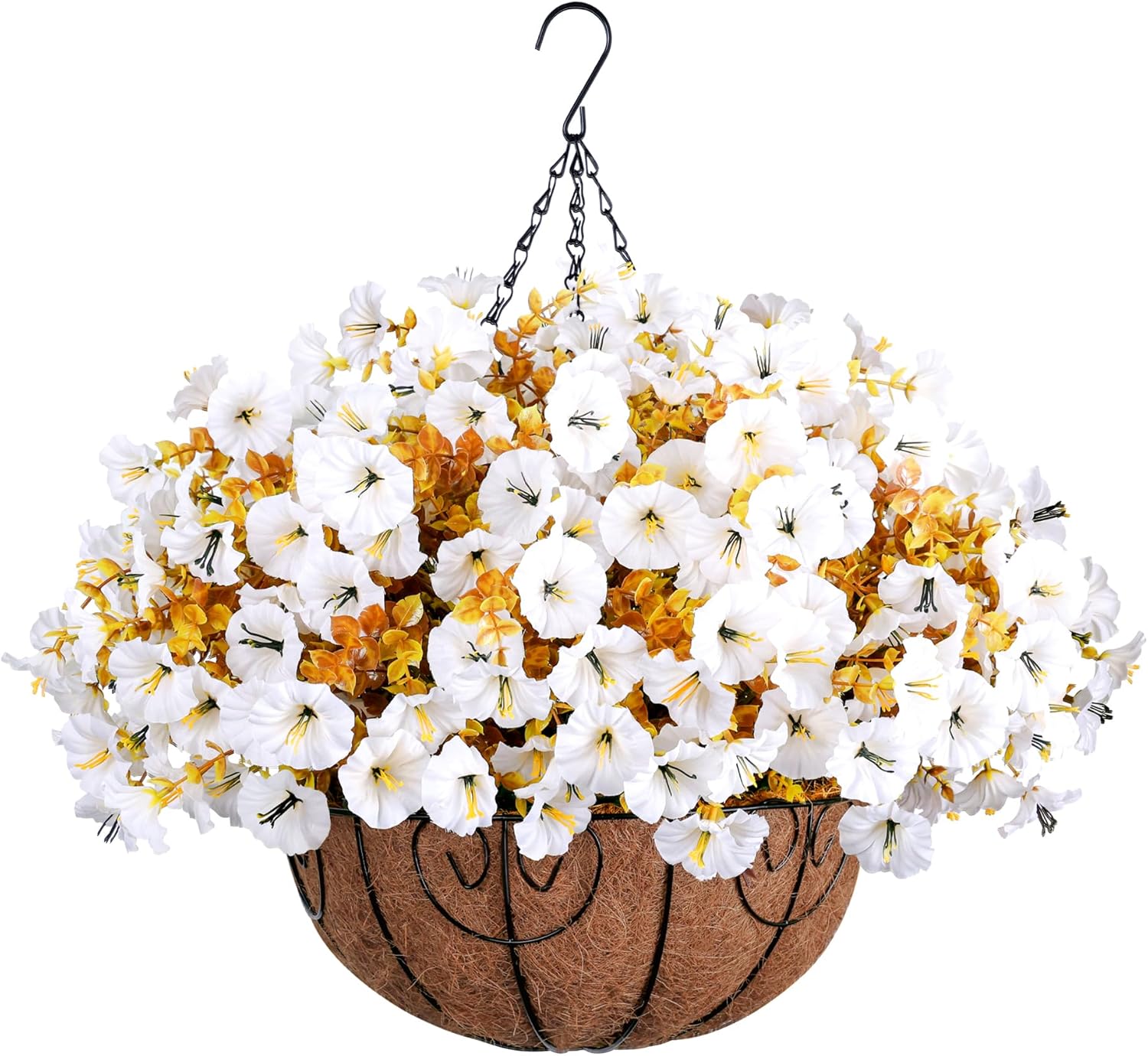 Artificial Fall Flowers Fake Hanging Plants Flowers Basket for Outdoors Autumn Decoration, Silk Morning Glory with Eucalyptus Look Real UV Resistant Faux Flowers for Outside Porch Patio Balcony, White