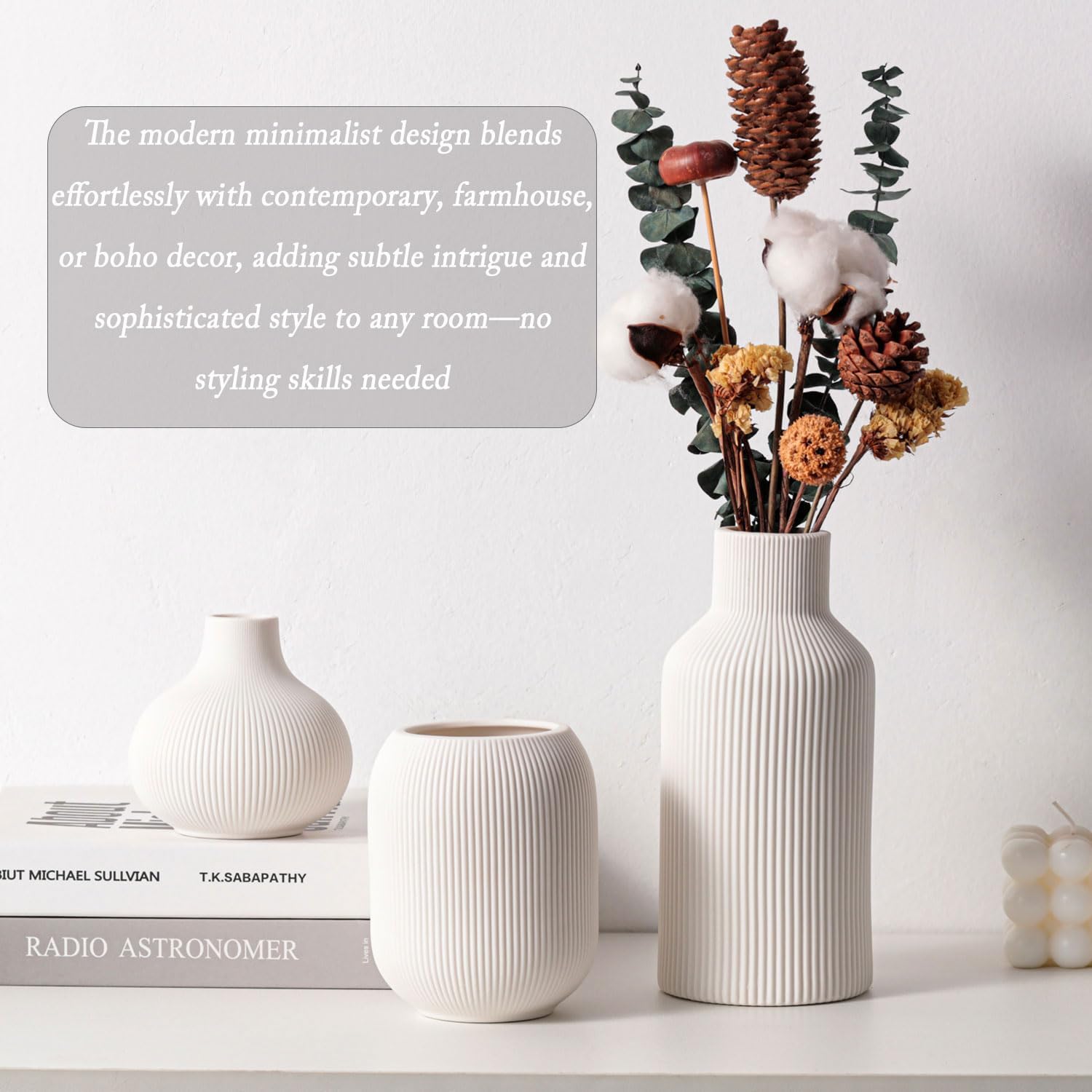 - Modern Ribbed Texture & Minimalist Design:Elevate your space with this set of 3 ceramic vases featuring ribbed texture and a sleek matte white finish. The modern minimalist design blends effortlessly with contemporary, farmhouse, or boho decor, adding subtle intrigue and sophisticated style to any room—no styling skills needed. Perfect as standalone accents or paired with faux/fresh flowers for a touch of elegance.