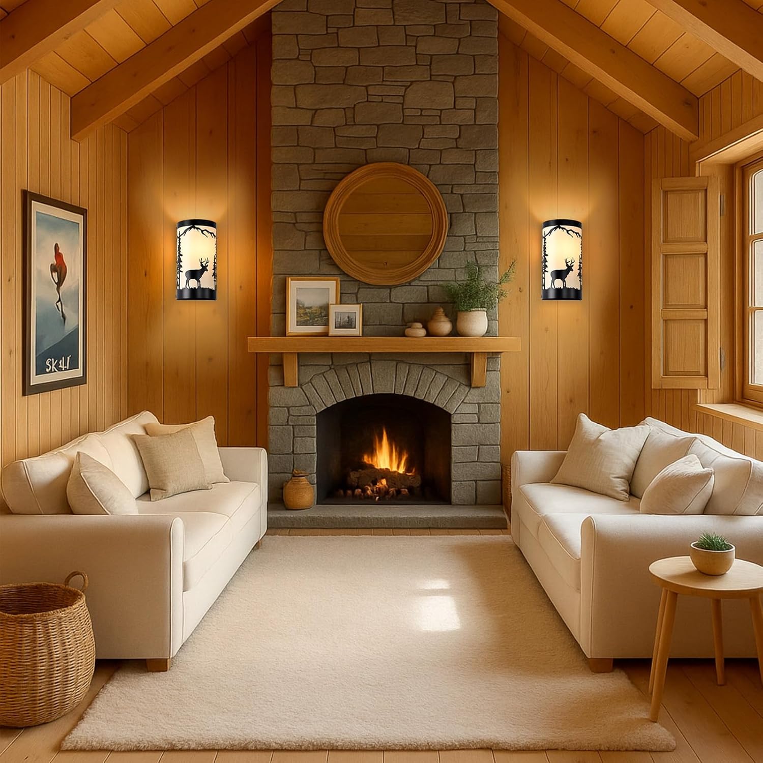 - Rustic Design: Farmhouse wall sconce is crafted from durable matte black metal,featuring intricate forest elements and a deer silhouette,white parchment paper adds a soft,warm glow,enhancing industrial aesthetic of the vintage wall sconce