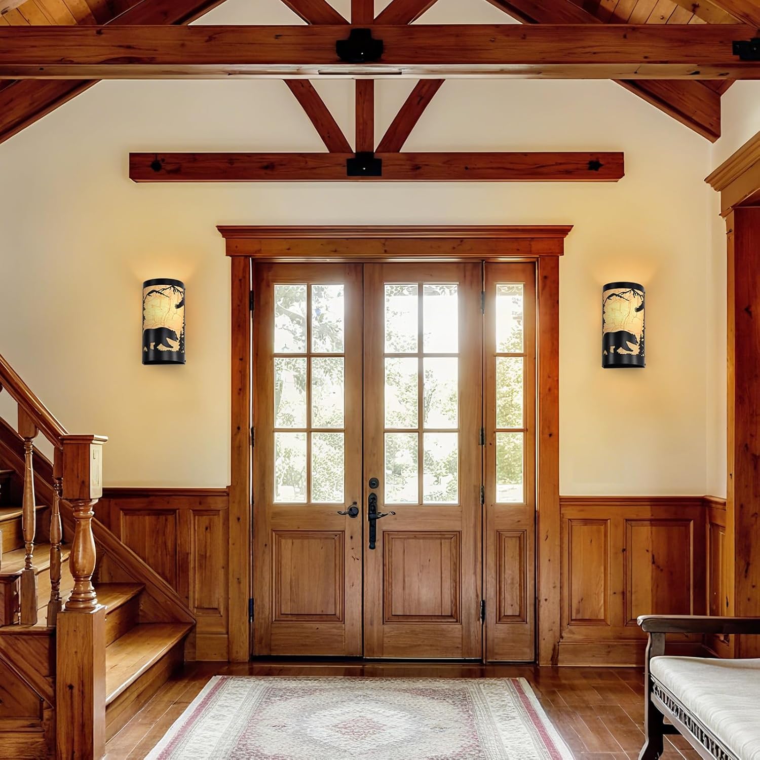 - Rustic Design:The wall sconce light is crafted from durable matte black metal,featuring intricate forest elements and a bear silhouette,yellow parchment paper adds a soft,warm glow,enhancing industrial aesthetic of the vintage wall sconce