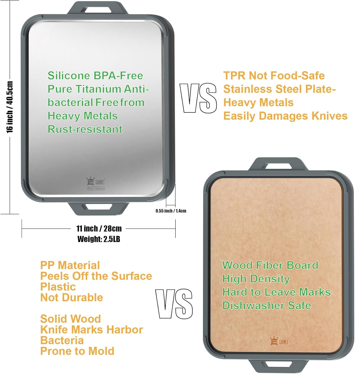 - 2-in-1 Titanium Cutting Board: Redefine Your Kitchen Game Tired of switching between multiple cutting boards? Meet our 2-in-1 Titanium Cutting Board—the ultimate kitchen hack you never knew you needed! With a food-grade pure titanium side for raw and cooked meats and a wood fiber side for fresh produce, this cutting board is your one-stop-shop for all your chopping needs.