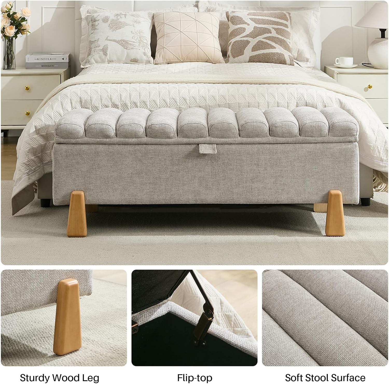 - Elevated Soft-Touch Design: Features Clean-Lined With Luxurious Upholstery,Accented By Natural Wooden Tapered Legs; Safely Supporting Stored Items And Daily Use, While Its Rounded Corner Design Protects Against Bumps. Adds A Touch Of Minimalist Elegance To Bedrooms, Living Rooms, Or Entryways.
