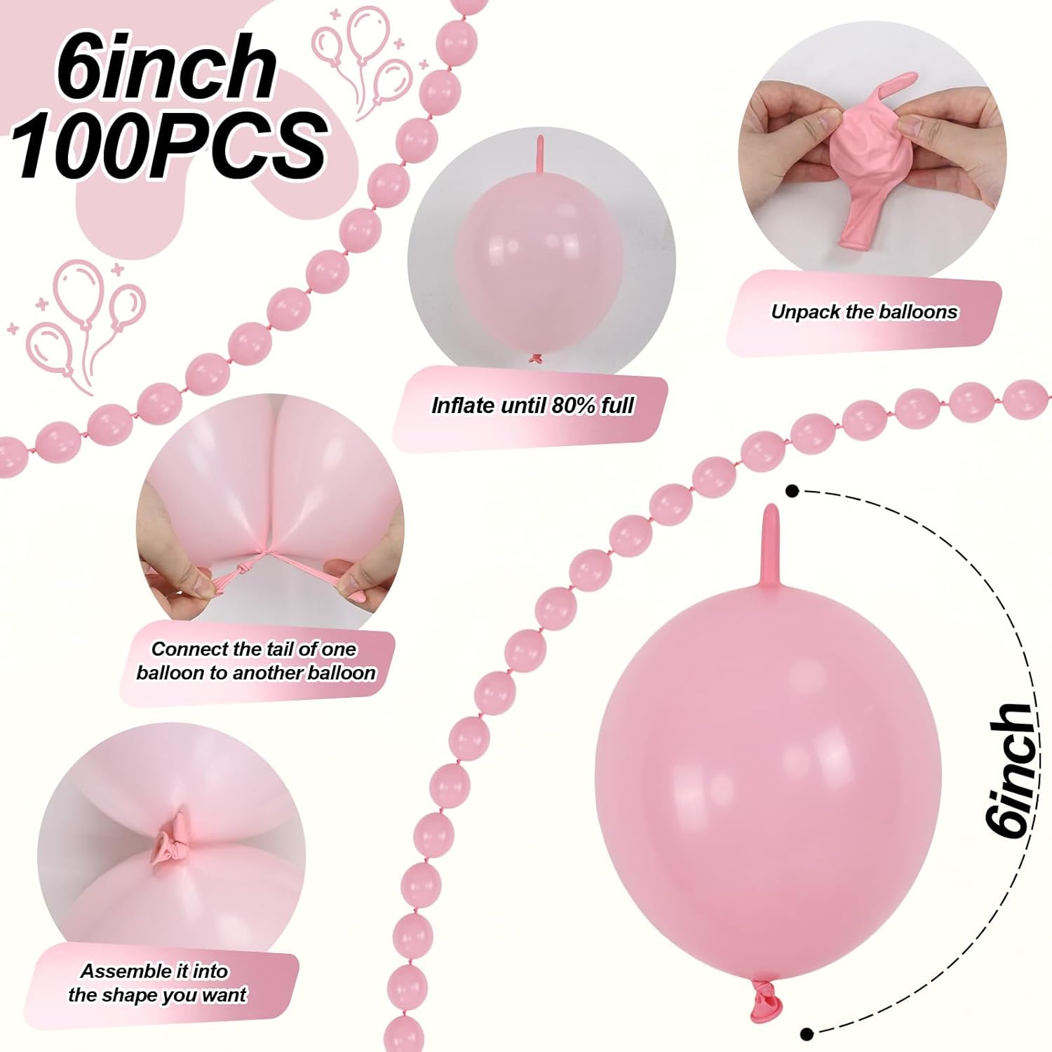 - Link Balloon Set - You will receive 100 pcs of 6 inch small light pink link balloons. Our connecting tail balloons have a unique tail design that allows balloons link to be easily. More convenient and easier to assemble than regular balloons.