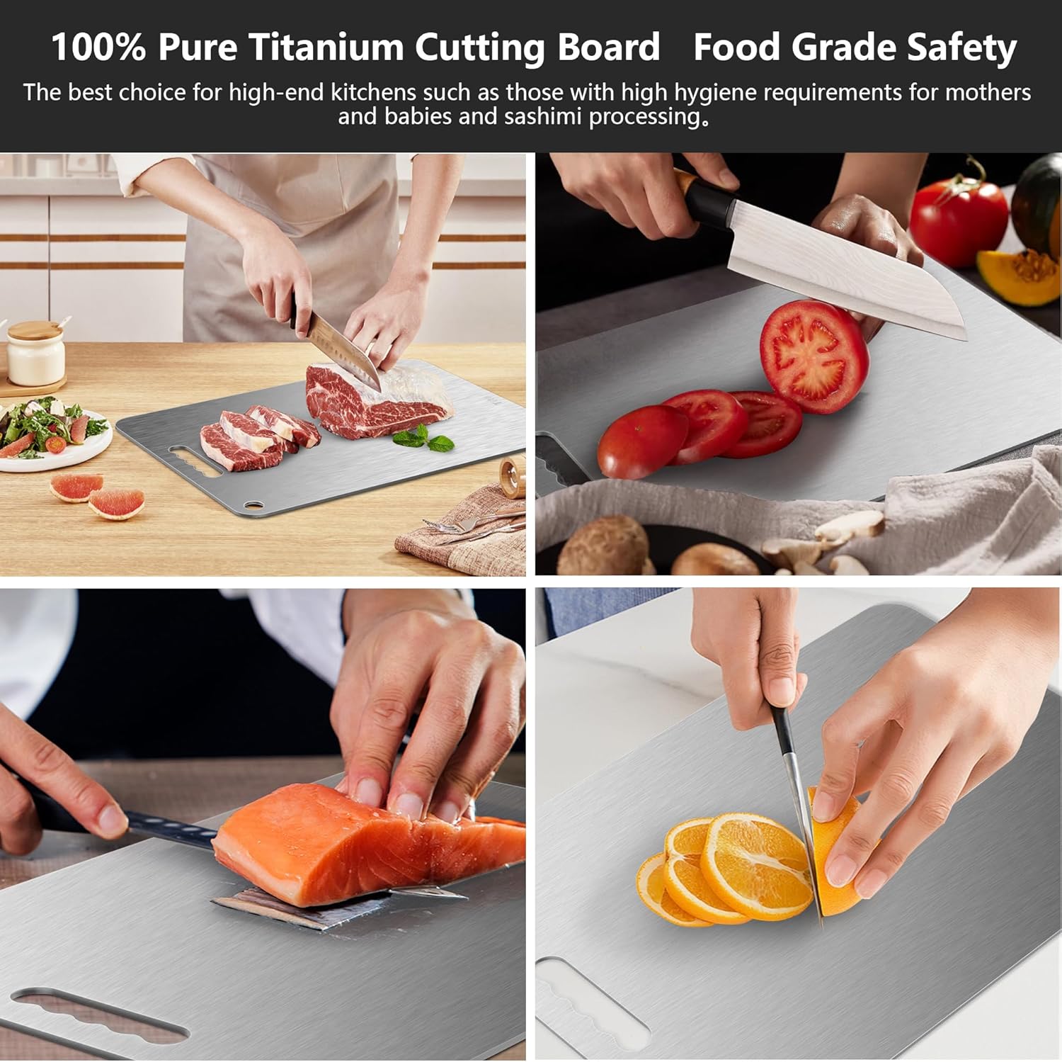 - Double-Sided Usability: Titanium cutting boards help separate ingredients, such as raw food from cooked food. Vegetables, fruits, and meats can be separated to avoid cross-use. The non-porous surface does not allow food particles to adhere.