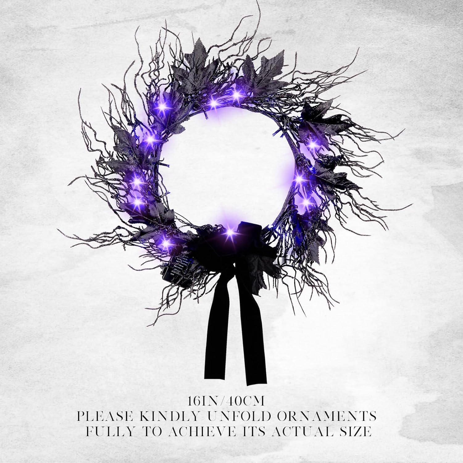 - π PERFECT PROPORTIONS - This 16-inch black Halloween wreath delivers classic spooky vibes in an ideal door-ready size. Featuring eerie black maple leaves and integrated color-changing lights, it effortlessly elevates your haunted entryway or mantel while embodying Halloweenβs signature dark allure.