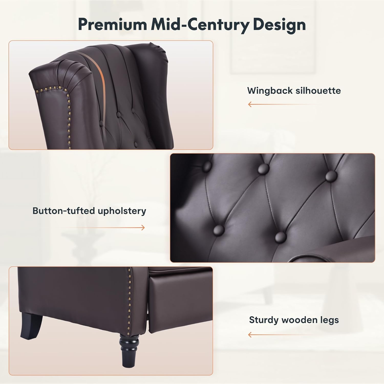 Softa Recliner Chair for Adults, Mid Century Wingback Pushback Accent Chair with Rivet Decoration, Tufted Upholstered Single Sofa Armchair for Living Room, Bedroom, Study (PU, Brown)