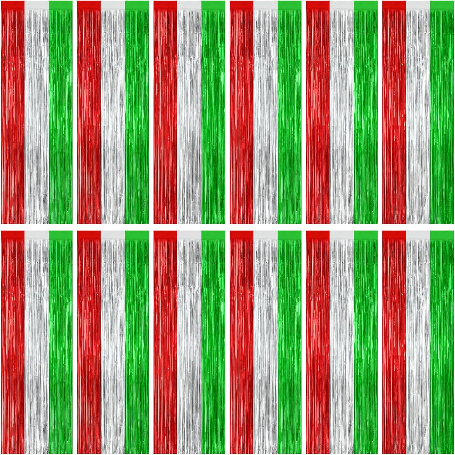 12 Pack Christmas Party Backdrop, 3.28 FT x 7.05 FT Red Silver Green Foil Streamer, Metallic Fringe Curtains Tinsel Streamer, Hanging Christmas Decorations Picture Props Door Decor