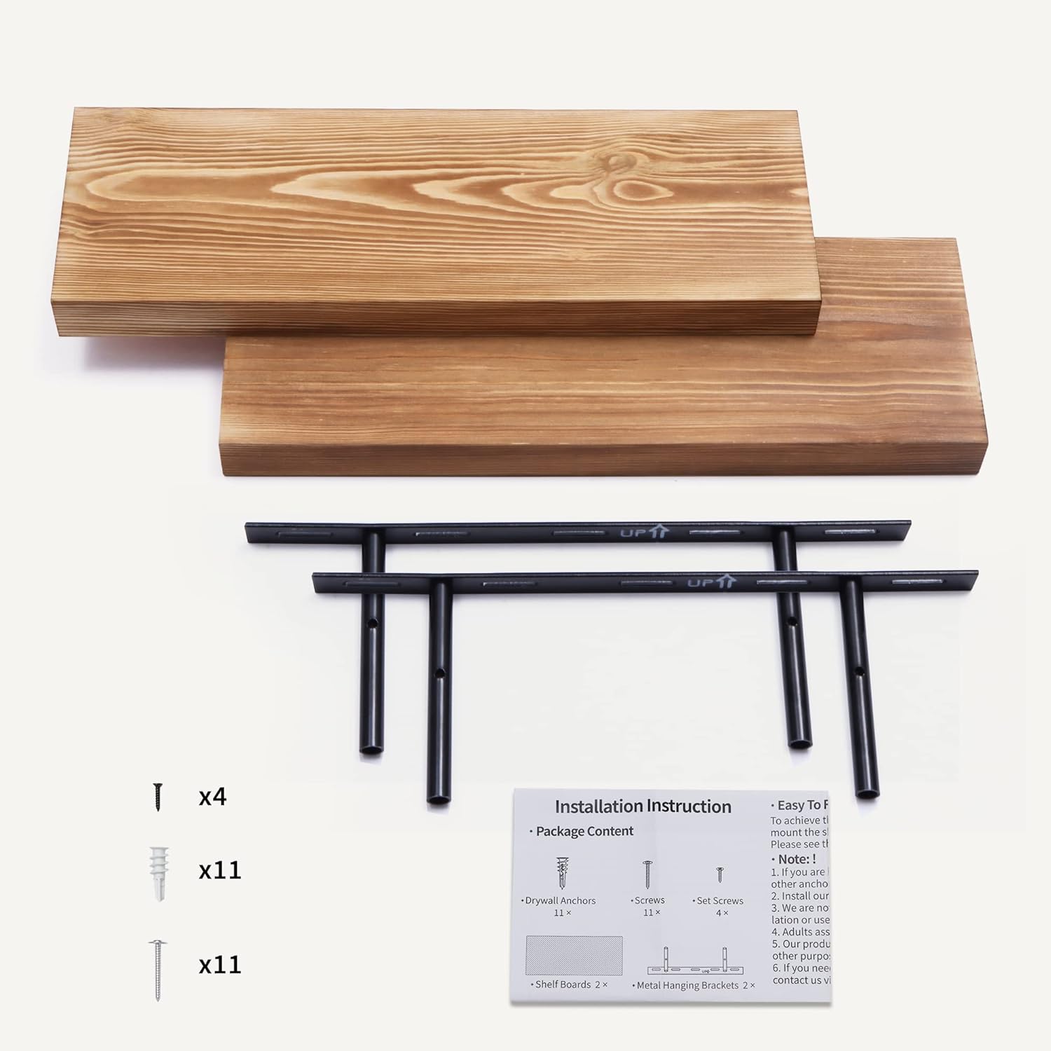 Fun Memories European Pine Floating Shelves for Wall, Mounted Shelf for Decor Storage Set of 2 - Natural Rustic Wooden Wall Shelf for Kitchen Bathroom Living Room Bedroom Farmhouse - Carbonized