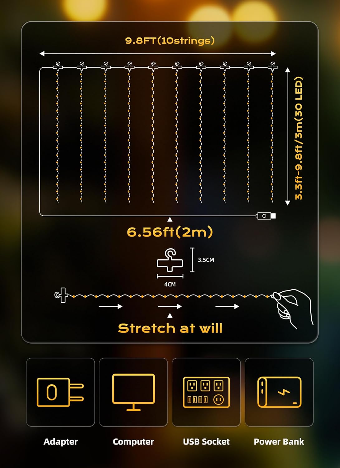 - [300 LED Curtain String Lights] (Curtain is NOT included) (Hook size: 3.5cmΓ4cm) 300 individual LEDs, 9.8ft x 9.8ft Led Curtain Lights , made of copper wire, soft texture, can be cut freely without affecting the rest, so you can DIY any decoration you like.Copper wire drop strings is tough and flexible, hanging and adjustable desired height naturally easily; No limits to your imagination, Do the shape you like; Enjoy a fairytale world