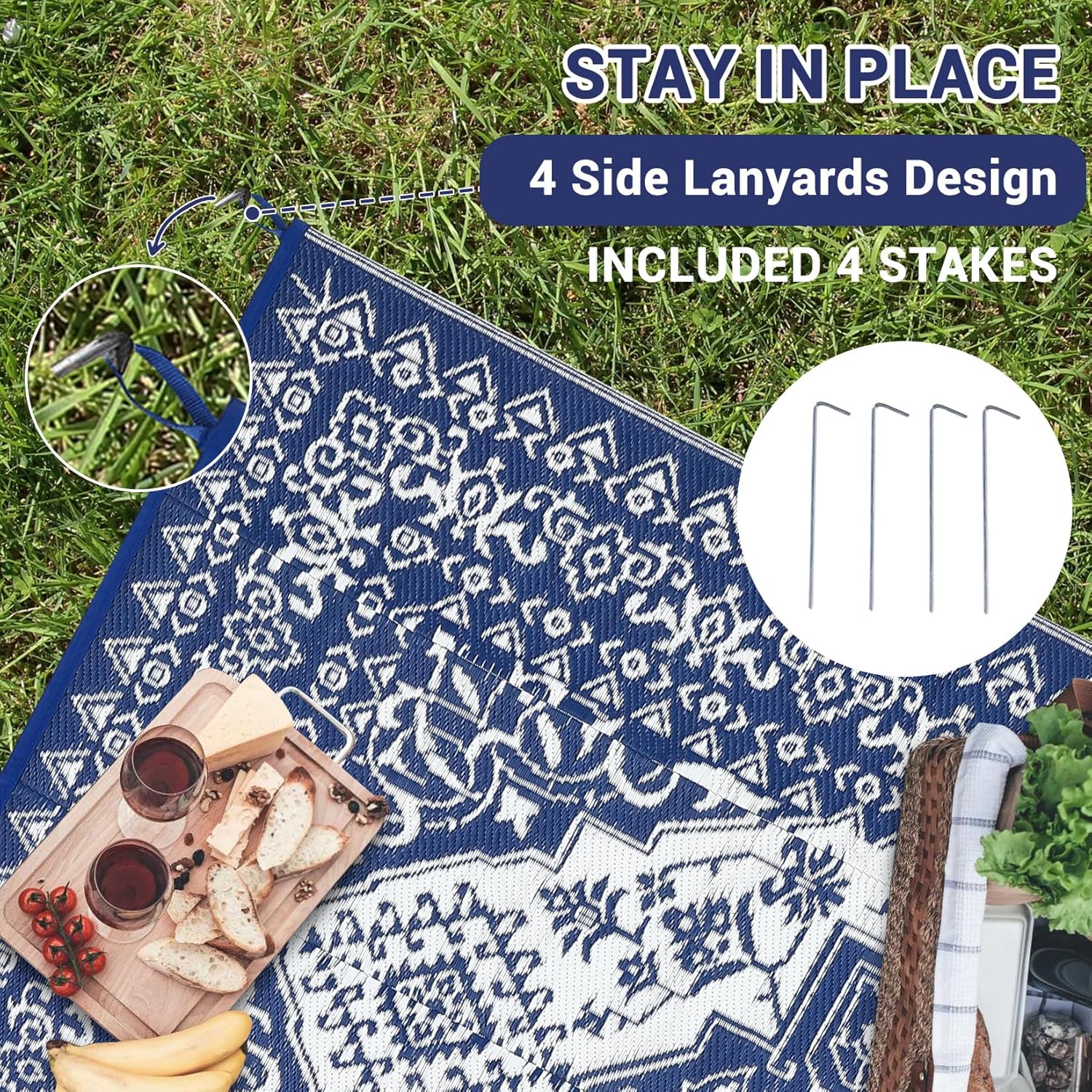 GAOMON Large Outdoor Plastic Straw Rug 10x14 Waterproof Patio Rug Reversible Foldable Portale Camping Mat with Stakes & Bag, Vintage Boho Outside Carpet for RV Garden Deck Porch, Navy