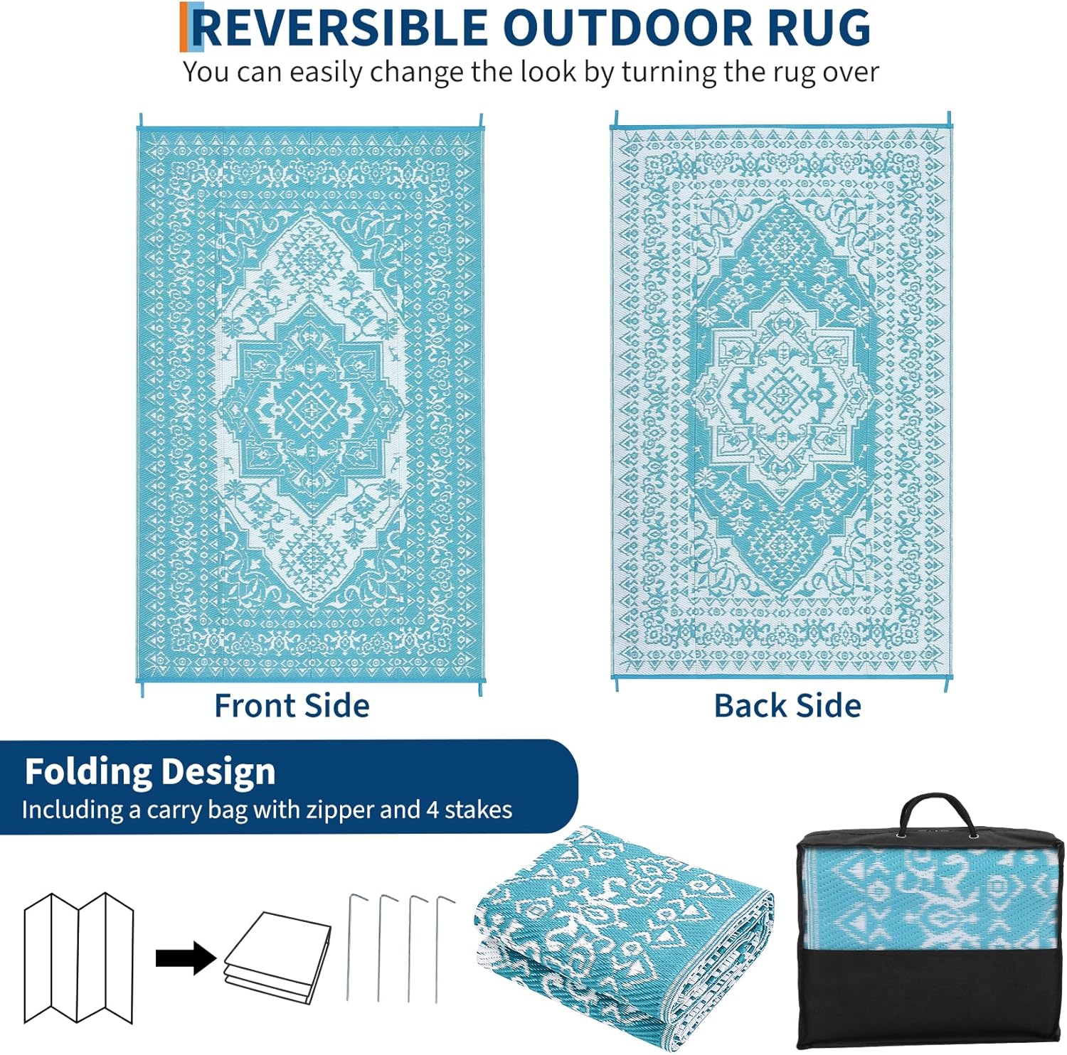 - Portable & Versatile: Lightweight and foldable, this waterproof camping rug comes with a handy carrying bag, making it perfect for road trips, RV adventures, picnics, or beach outings. Easily store or move it whenever you need extra style or comfort