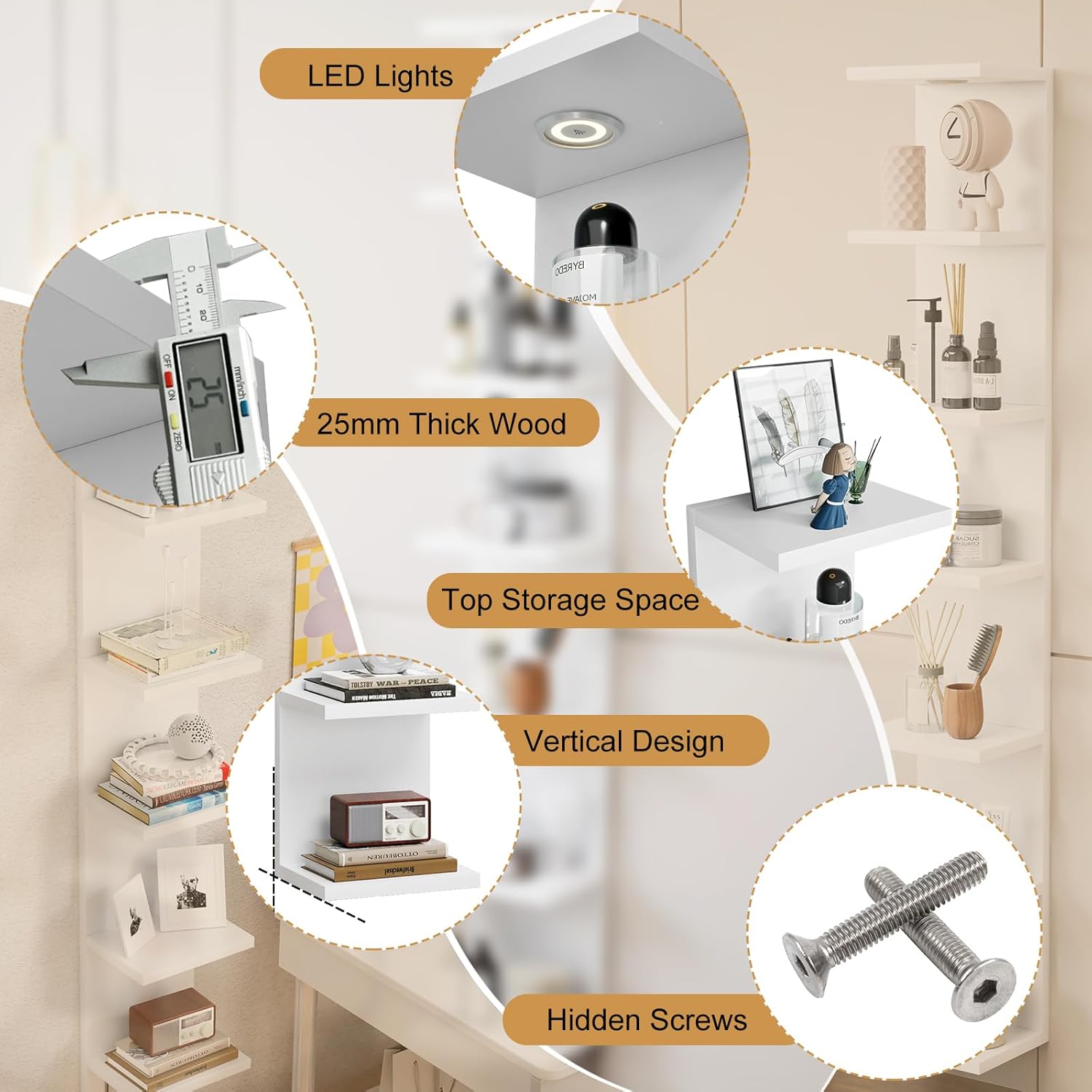 - ăWide Applicationsă- It can be used as a cabinet bottom lamp in the kitchen, as a desktop light in the office, as a TV cabinet background decor in the living room, as a cosmetics storage with fill light in the bedroom, and provide light assisted night pickup in the entrance to avoid turning on the headlights to disturb others. This white wall shelf unit can create a beautiful & refined atmosphere for your home or work environment, and its an ideal storage and decor complement, can be widely used in home or business space