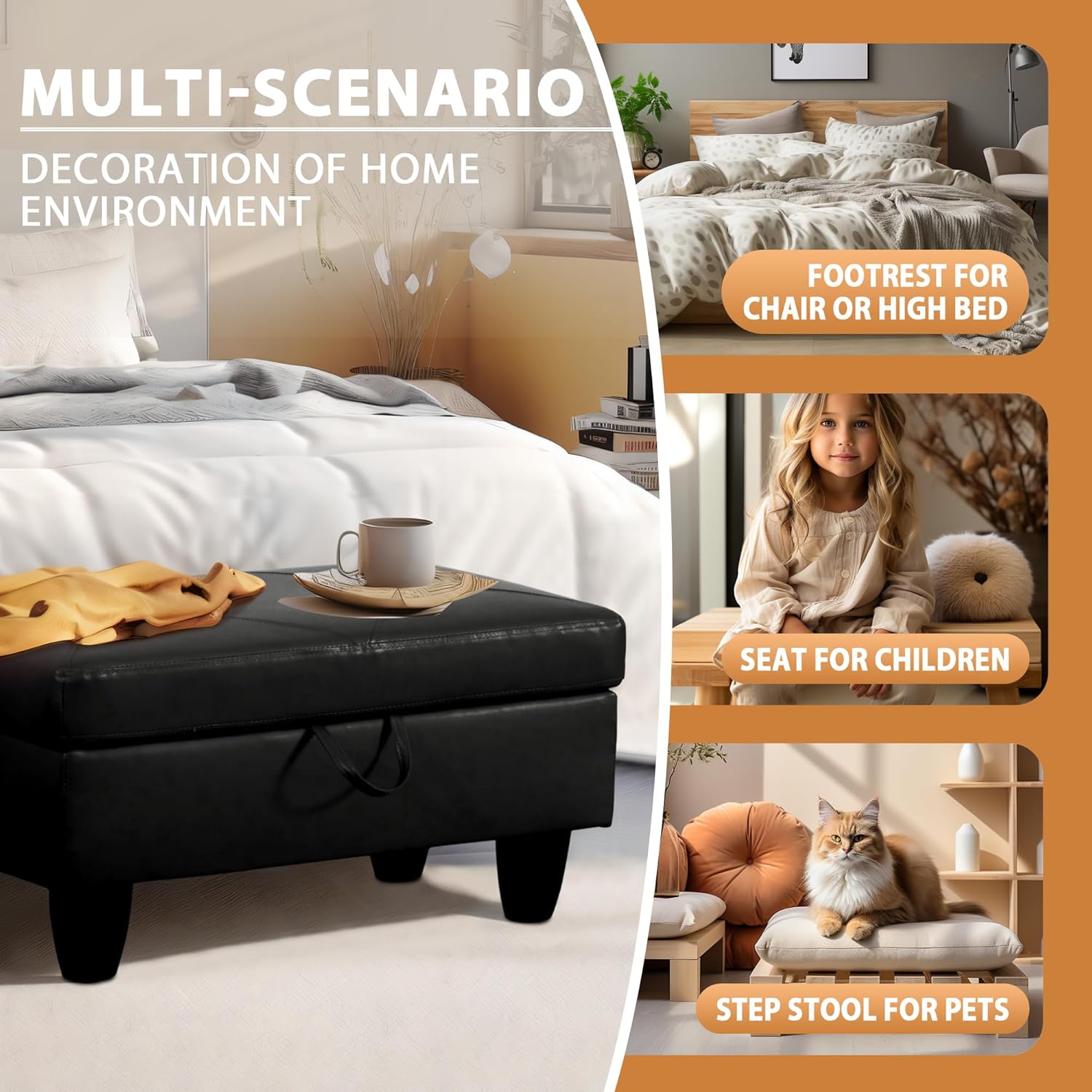 - PREMIUM MATERIALS: This storage ottoman features a thick foam cushion for added comfort. Built with a sturdy solid wood frame and durable plastic feet, it offers long-lasting quality while protecting your floors from scratches. The easy-to-clean faux leather surface gives it a sleek, modern look, and the smooth faux leather lid adds an extra layer of comfort for sitting. Perfect for any room, this ottoman combines style, durability, and functionality.
