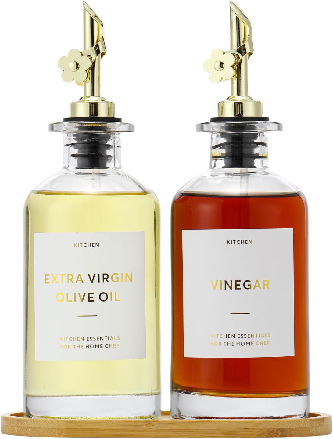 - KITCHEN OLIVE OIL BOTTLES – The oil and vinegar dispenser set contains 2 transparent 11.8oz (350ML) glass bottles, 2 gold stainless steel oil spouts, 17 gold waterproof labels(kinds of oil and vinegar) and a bamboo tray, Ideal for safely store and dispense your olive oil and vinegar.